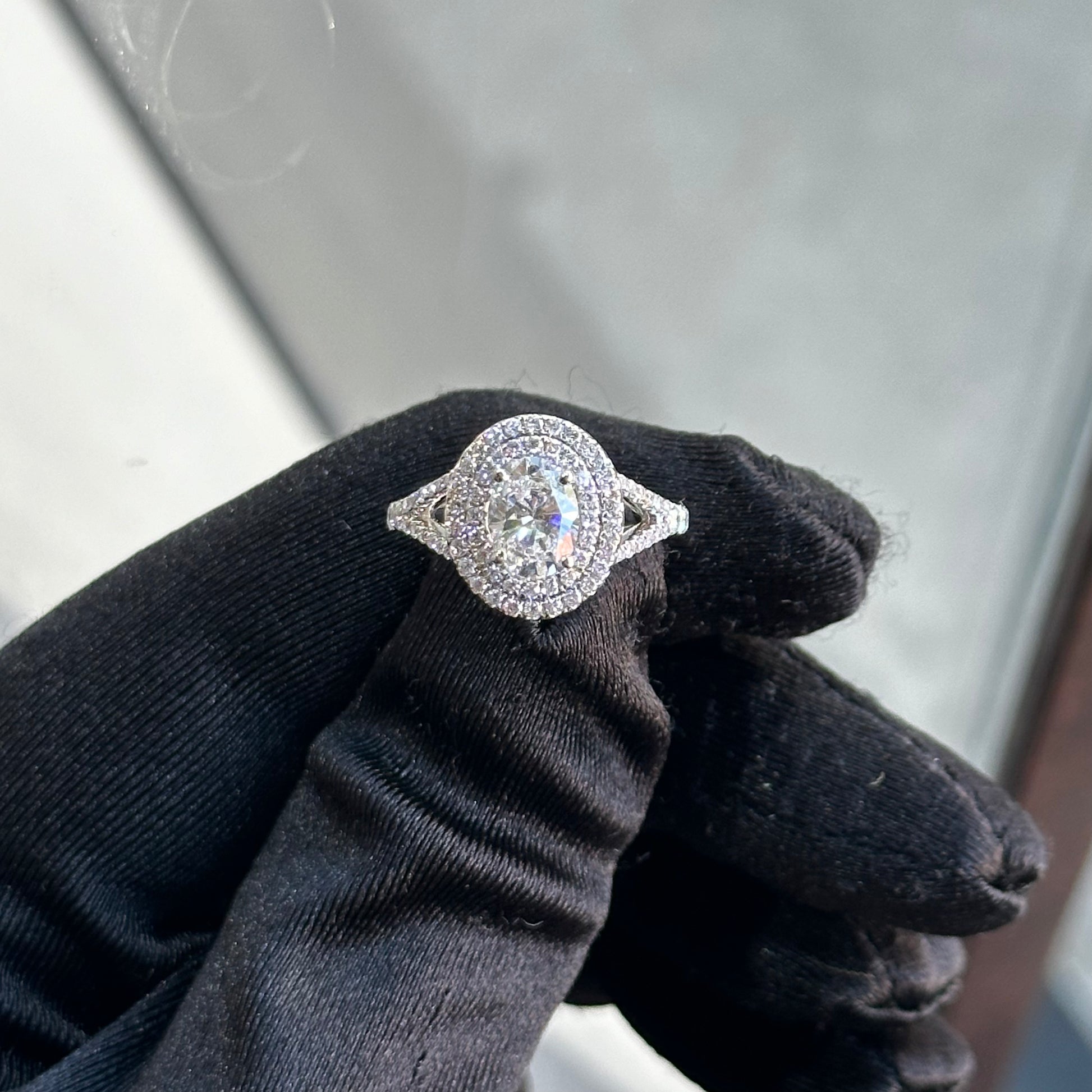 Beautiful 18kt white gold cathedral diamond engagement ring with double halo to enhance the brilliance of the center oval diamond. Showcasing a 1.14ct E VS2 center with round melees pave set on v- split shank. With a special touch, 1 bezel diamond is added on each side of the bridge to enhance the side profile along with diamonds pave set under the center head.