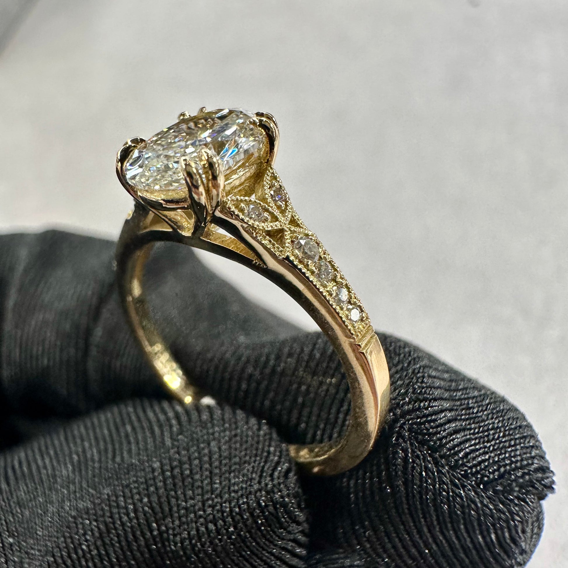 This 1.16ct Oval Diamond J Si2 Diamond 18kt Yellow Gold Engagement Ring is uniquely designed and handcrafted in-house with filigree etching and leaf cut outs. Its flush fit with most wedding rings and low setting make it a one-of-a-kind piece. Say "I do" in style with this playful and quirky ring!