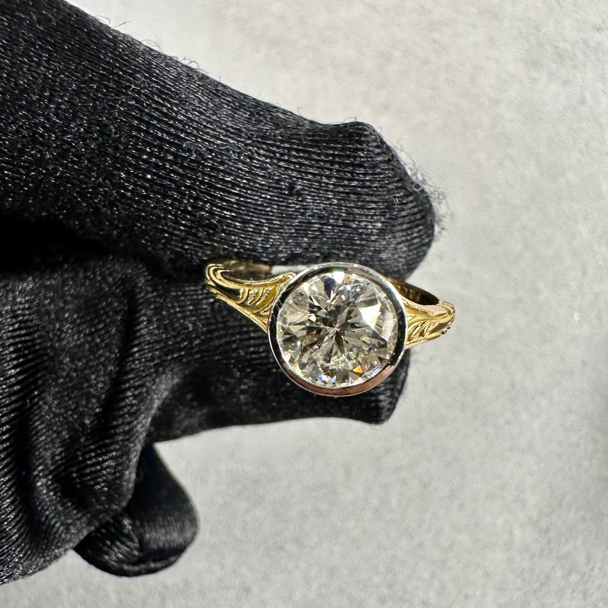 Declare your love in truly exquisite style with this two-tone, 1.31ct Round Brilliant Cut Diamond Engagement Ring. The handcrafted design boasts a stunning platinum bezel and an 18kt yellow gold shank, coupled with a majestic crown based on an Edwardian-inspired pattern, for a look of timeless sophistication. The centerpiece diamond 1.31ct in an I SI1 quality is set to perfection, ensuring a magnificence you can treasure forever.
