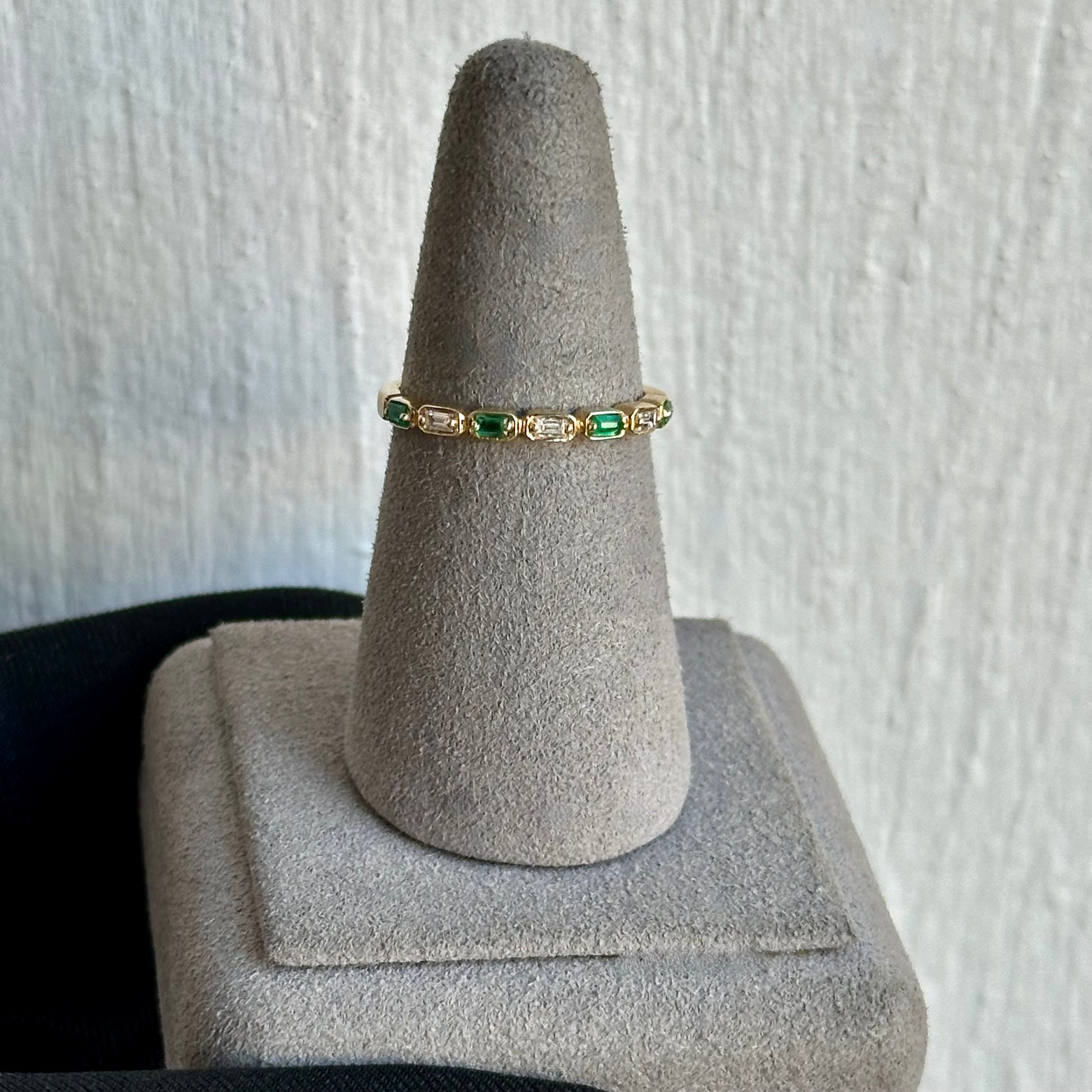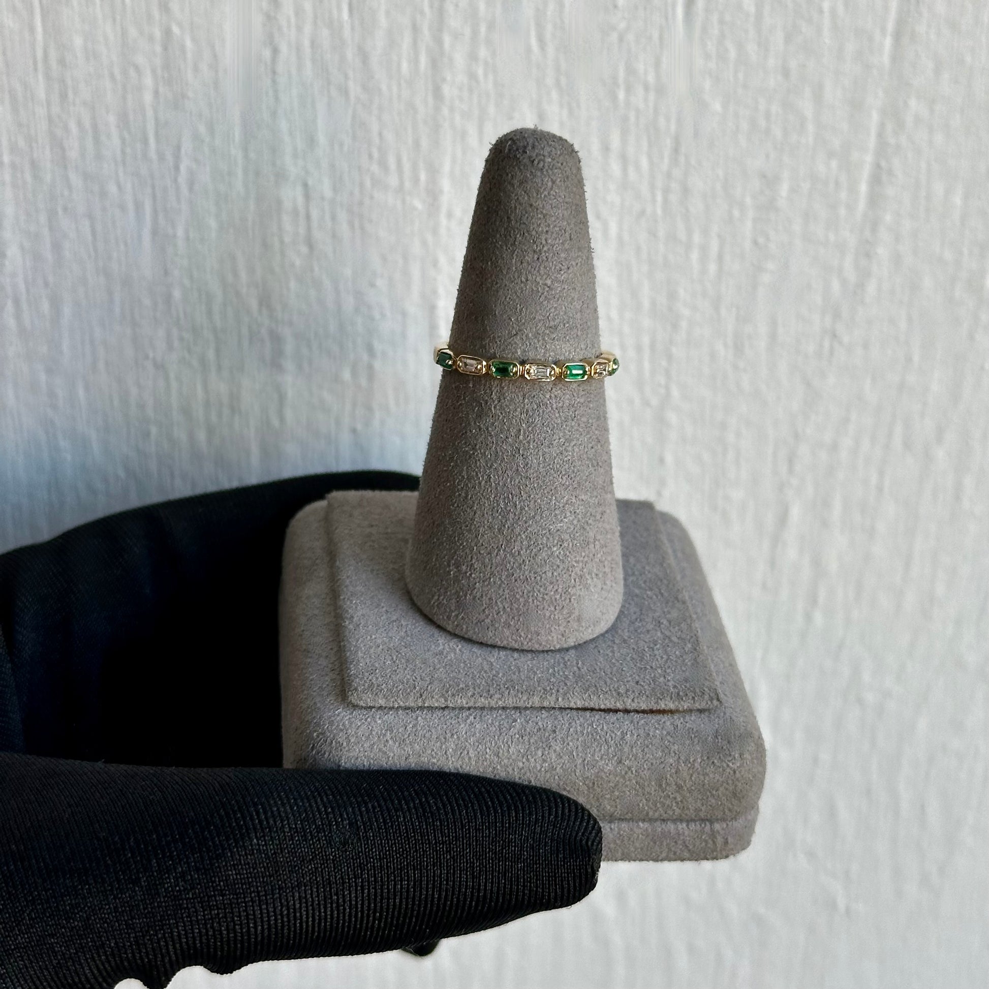 The alternating baguette diamonds and emeralds bring a luxurious touch, with the vibrant green hue of the emeralds beautifully offsetting the sparkling white diamonds. Ideal for stacking or wearing alone, this band is an elegant choice for engagements, anniversaries, or as a special gift for someone who loves timeless beauty with a contemporary twist.