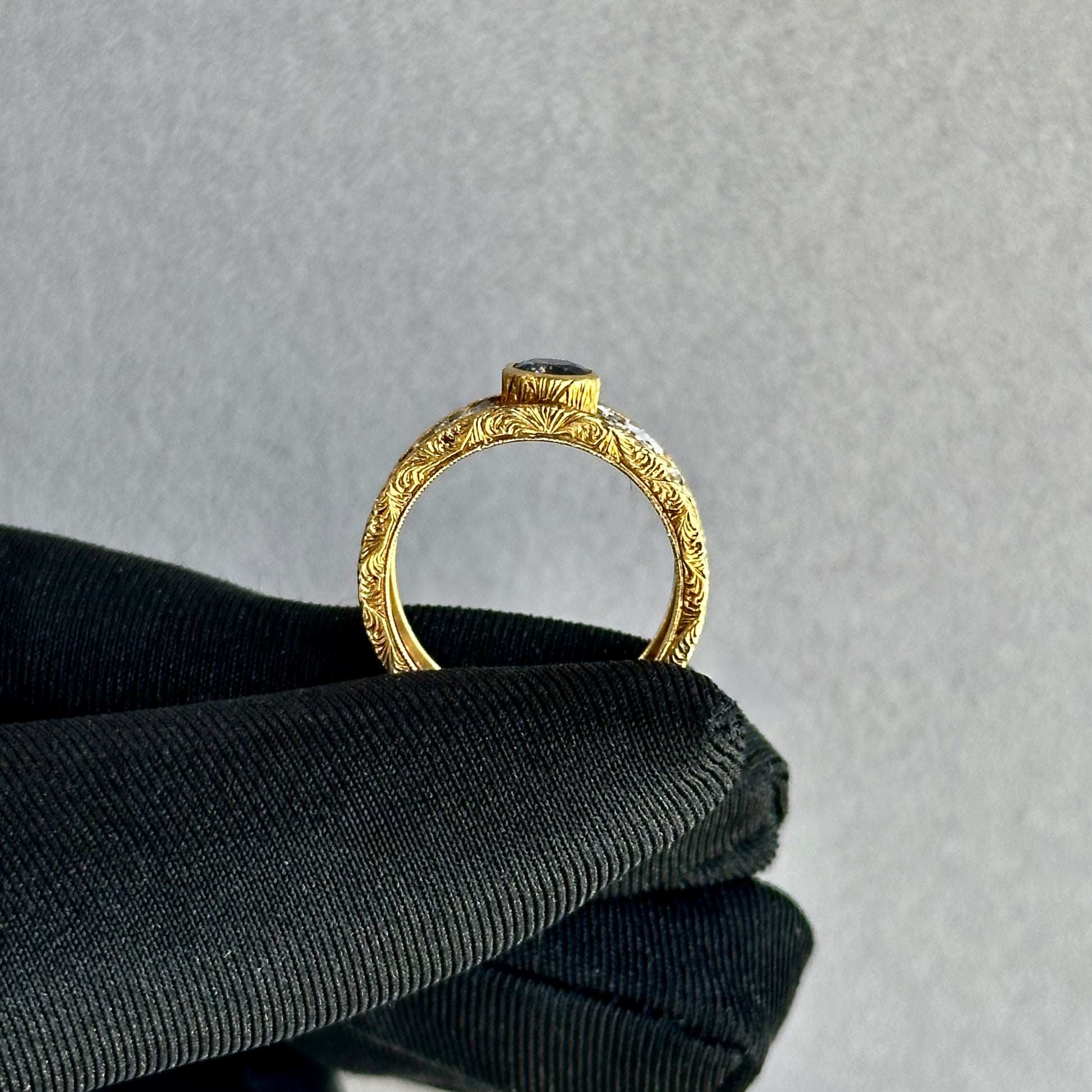 This breathtaking 18K yellow and white gold ring is a masterpiece of craftsmanship and design, reminiscent of classic Buccellati-style artistry. Measuring 9.5mm wide and crafted in finger size 7, it showcases a natural oval sapphire (approximately 7.5×6×3.8mm) set in a finely etched bezel that enhances the stone’s deep, velvety blue hue.