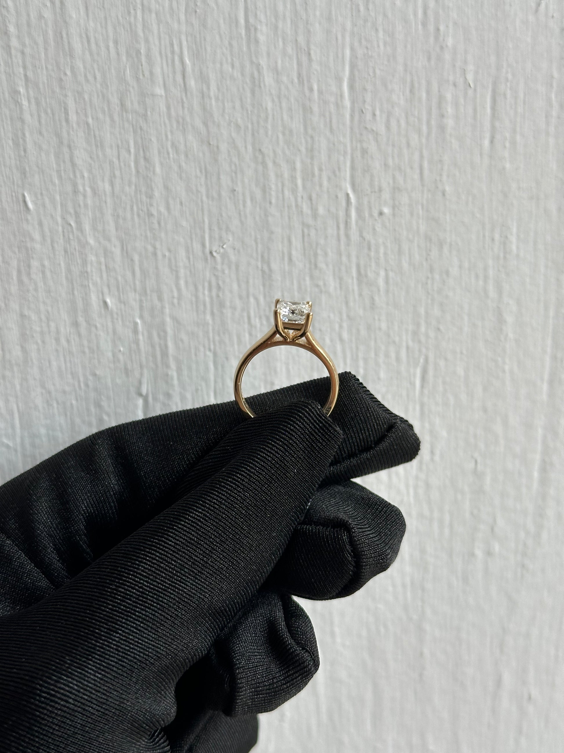 Crafted in 14kt yellow gold, this engagement ring features a 1.59ct H-SI1, GIA certified Emerald Cut Diamond set in a sleek and simple 4 prong mounting. The flat band adds a touch of modern elegance to the traditional solitaire design.