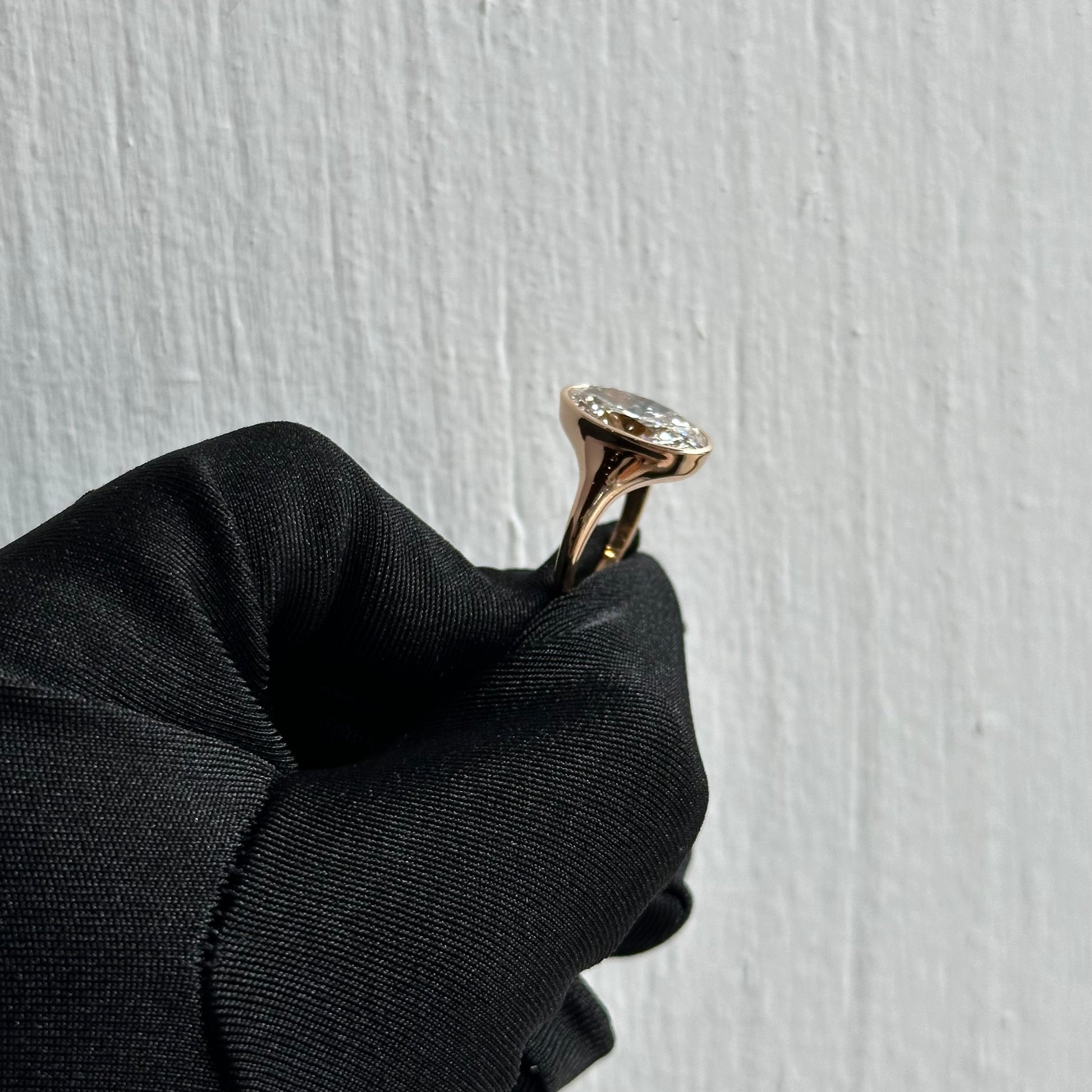 This elegant rose gold signet-style engagement ring showcases a 5.12ct oval lab grown diamond, with a G color grade and VS2 clarity rating. Meticulously designed and crafted in-house, this ring exemplifies our industry expertise. The minimalist bezel setting adds a delicate touch, while the perfect blend of tones and cascading metal make for a flawless piece.