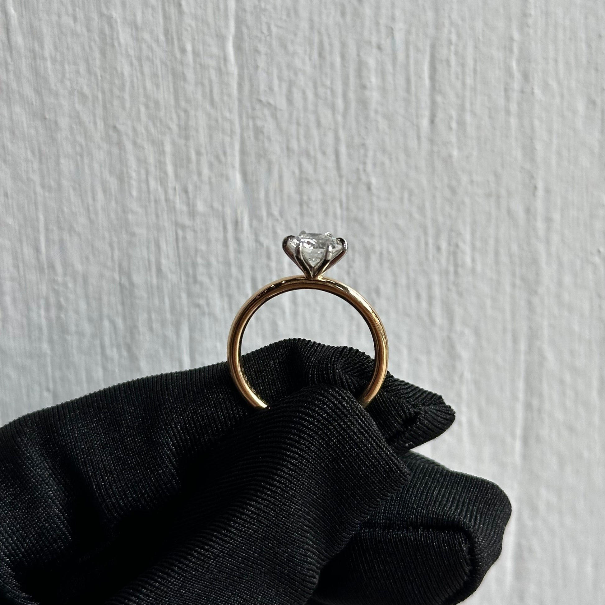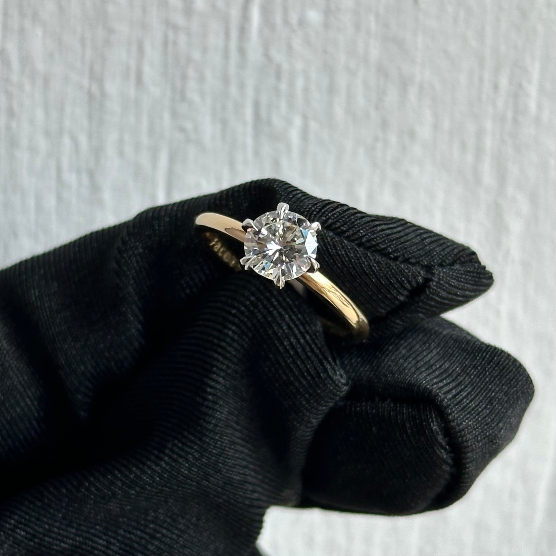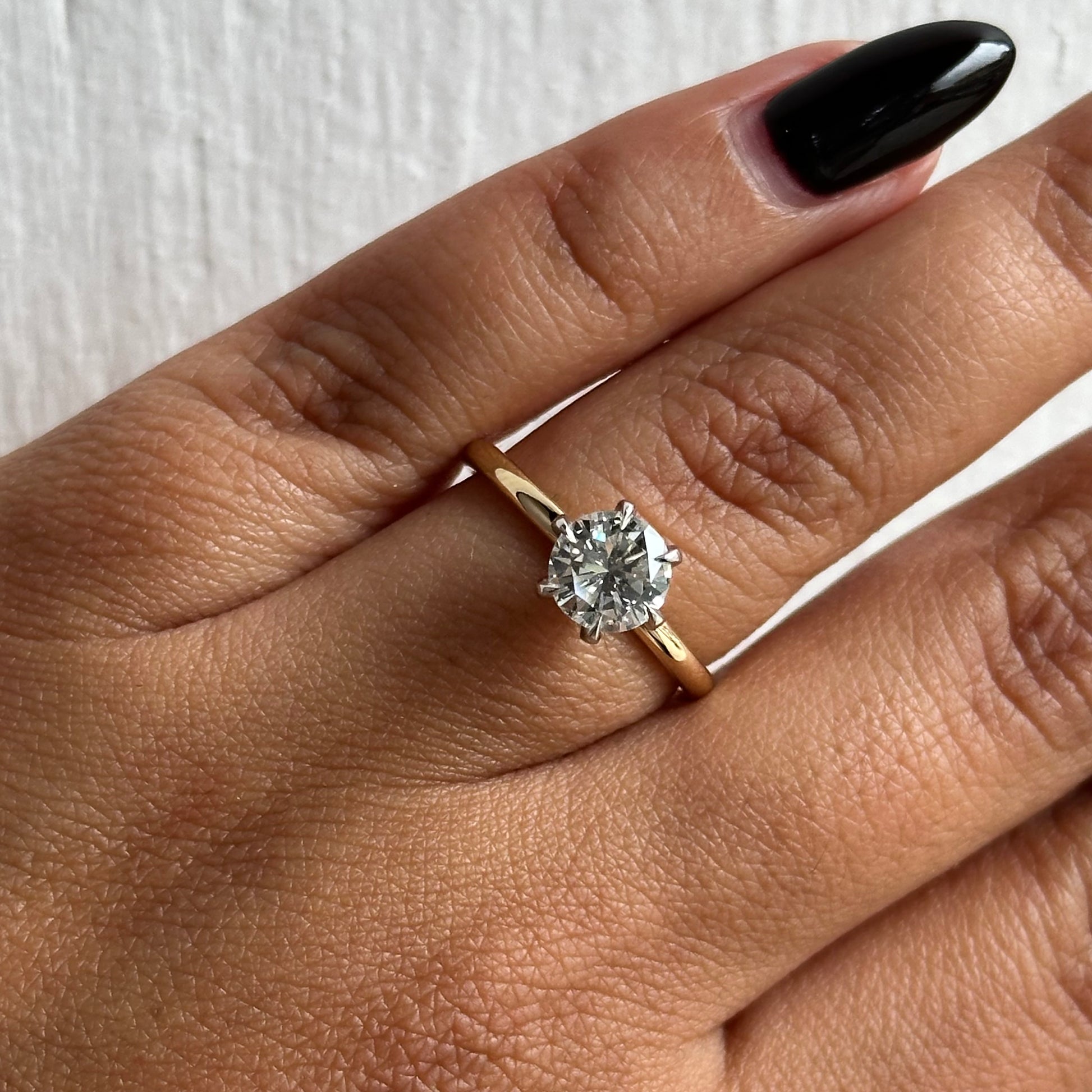Crafted in 18kt yellow gold and platinum prongs, this 6 Prong Round Brilliant Cut Diamond Solitaire Engagement ring features a center diamond of 1.03ct with a G VS2 color and clarity. Meticulously designed and expertly crafted in-house, this stunning ring is made to seamlessly pair with any wedding band of your choosing, fitting delicately and aesthetically on the finger.