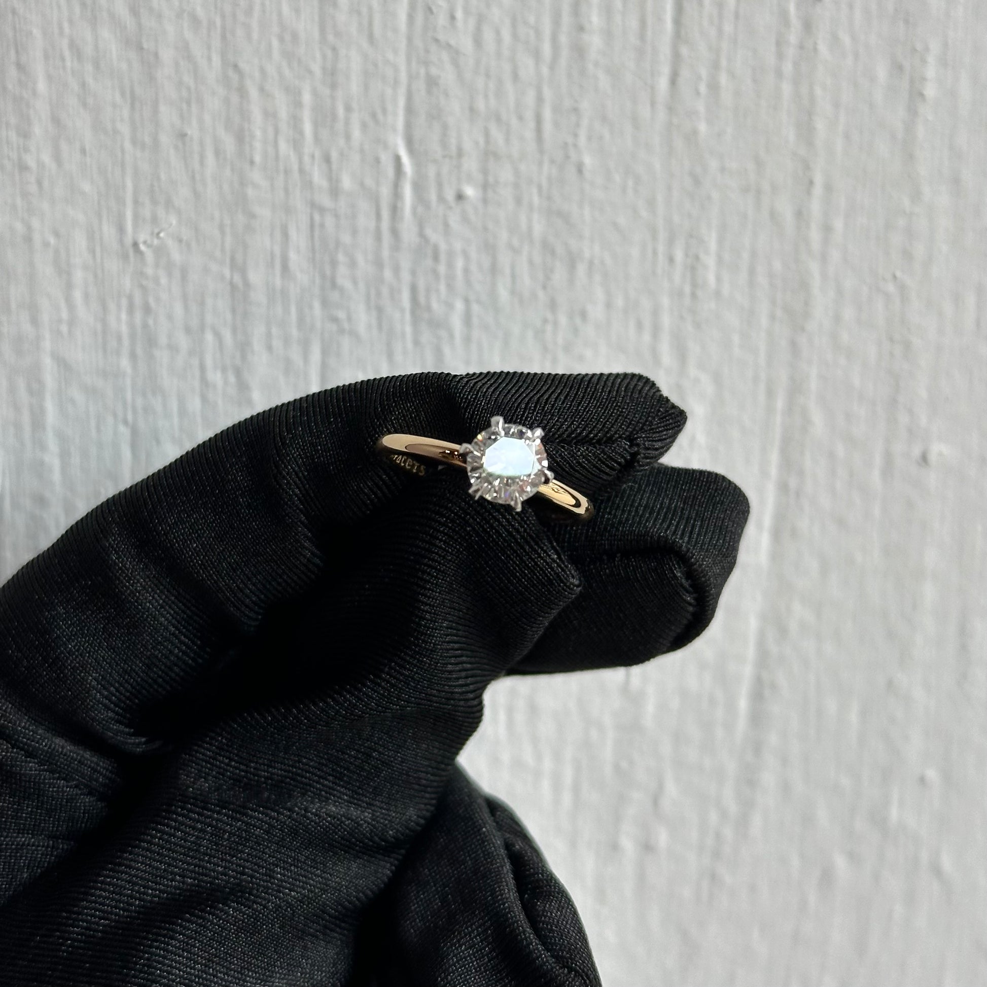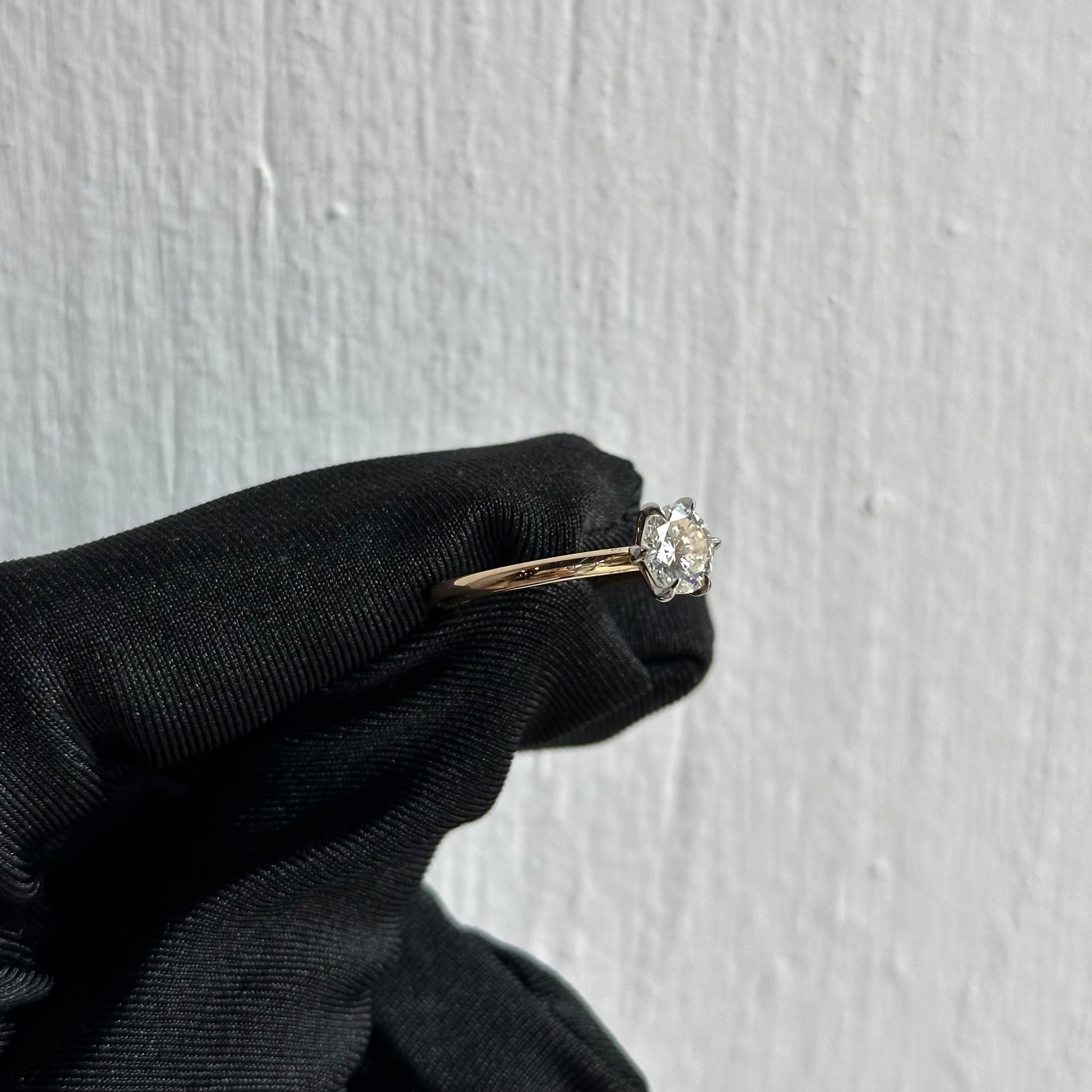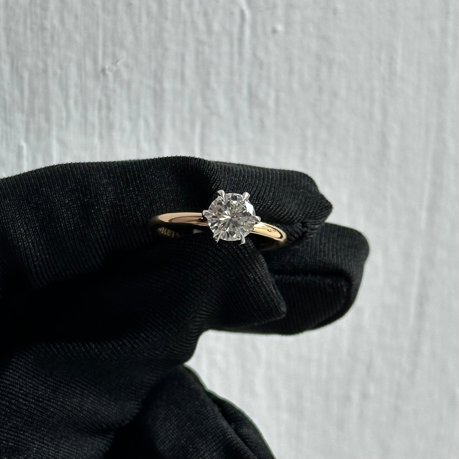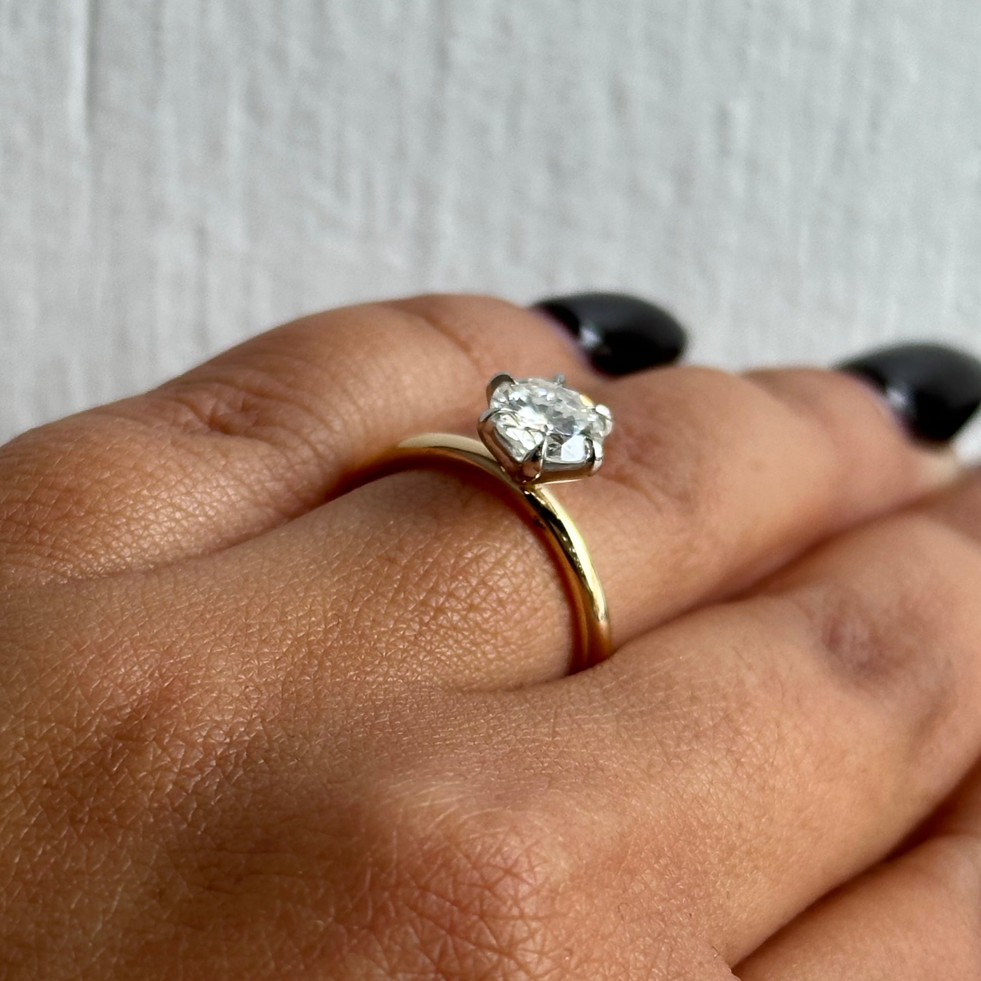 Crafted in 18kt yellow gold and platinum prongs, this 6 Prong Round Brilliant Cut Diamond Solitaire Engagement ring features a center diamond of 1.03ct with a G VS2 color and clarity. Meticulously designed and expertly crafted in-house, this stunning ring is made to seamlessly pair with any wedding band of your choosing, fitting delicately and aesthetically on the finger.