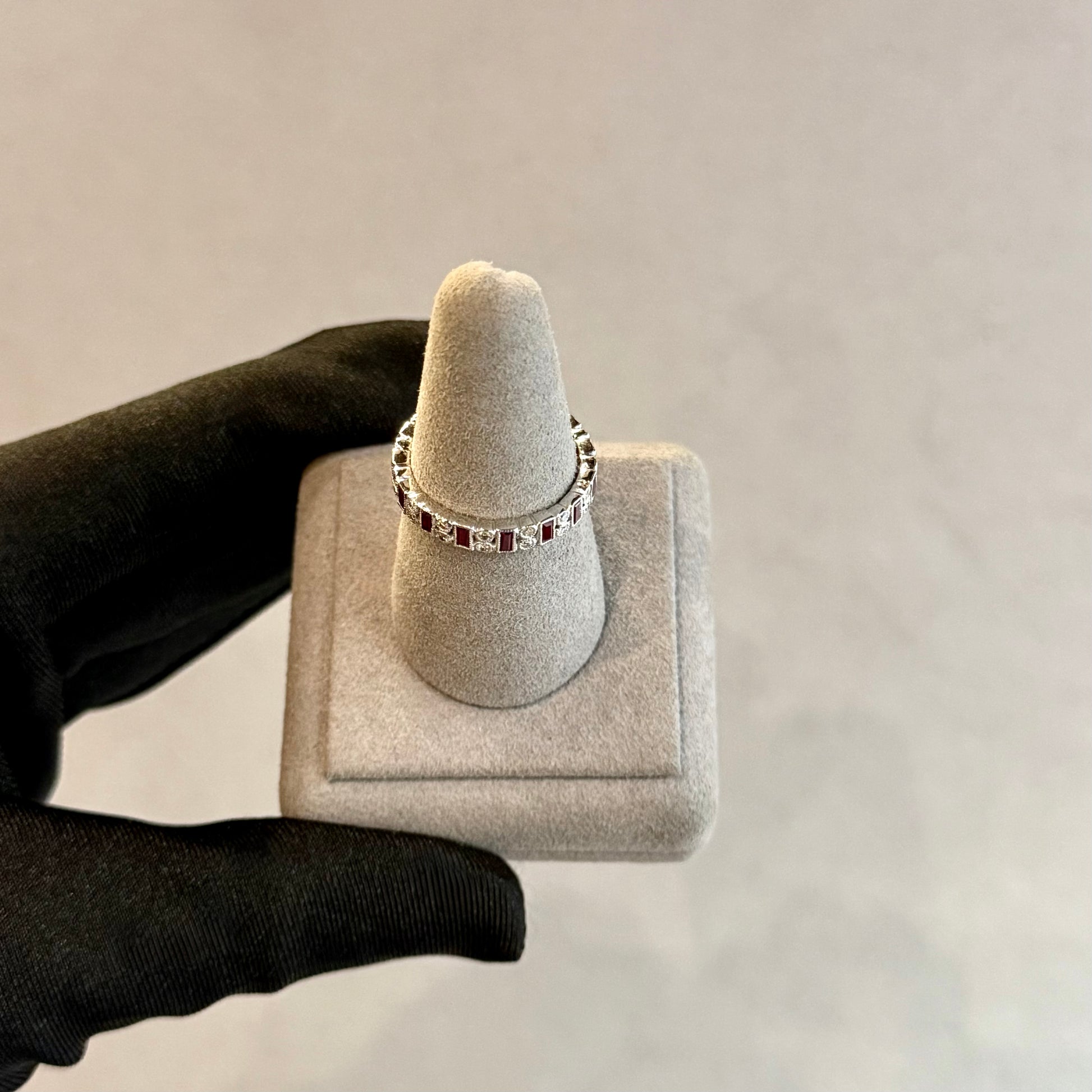 Art Deco 18K White Gold Ruby and Diamond Baguette Eternity Band – Milgrain Bezel Set