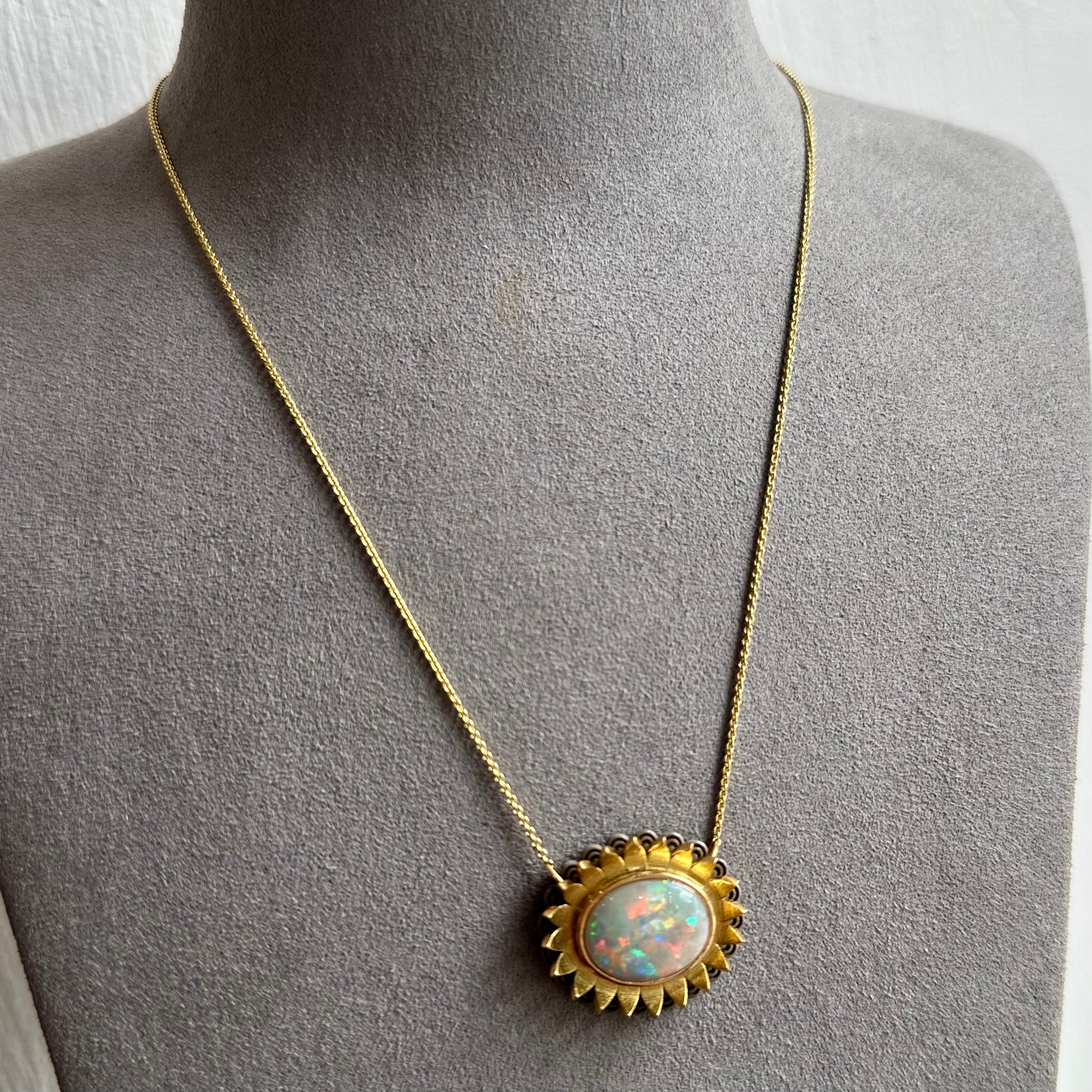 Discover the captivating Art Deco architecture of NYC with our stunning Art Deco Opal Sunflower Necklace. Expertly hand-crafted by our in-house designer, this necklace features a gorgeous 14kt yellow gold sunflower adorned with a beautiful White Opal that radiates a fiery glow in the sunlight. To add even more detail, the back of the sunflower design is hand-etched with oxidized silver. Each piece is unique and we take pride in creating one-of-a-kind pieces for our customers. Make a statement with this exquisite necklace.