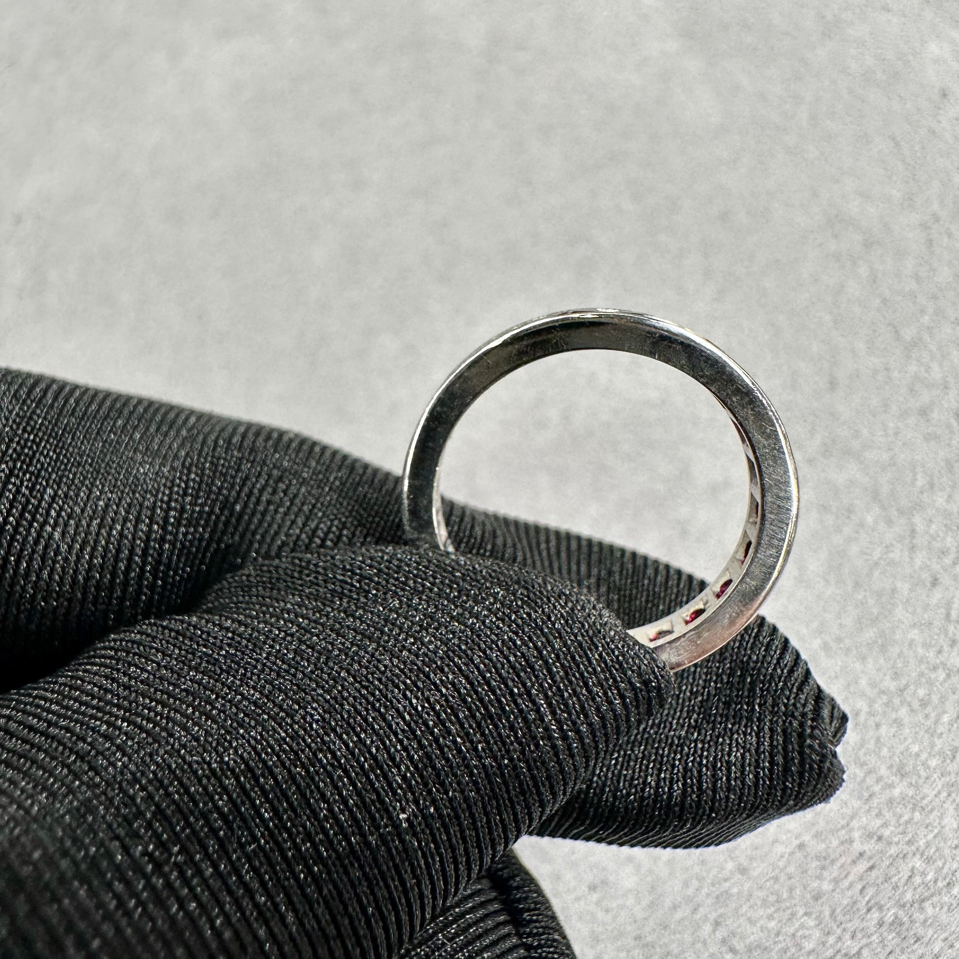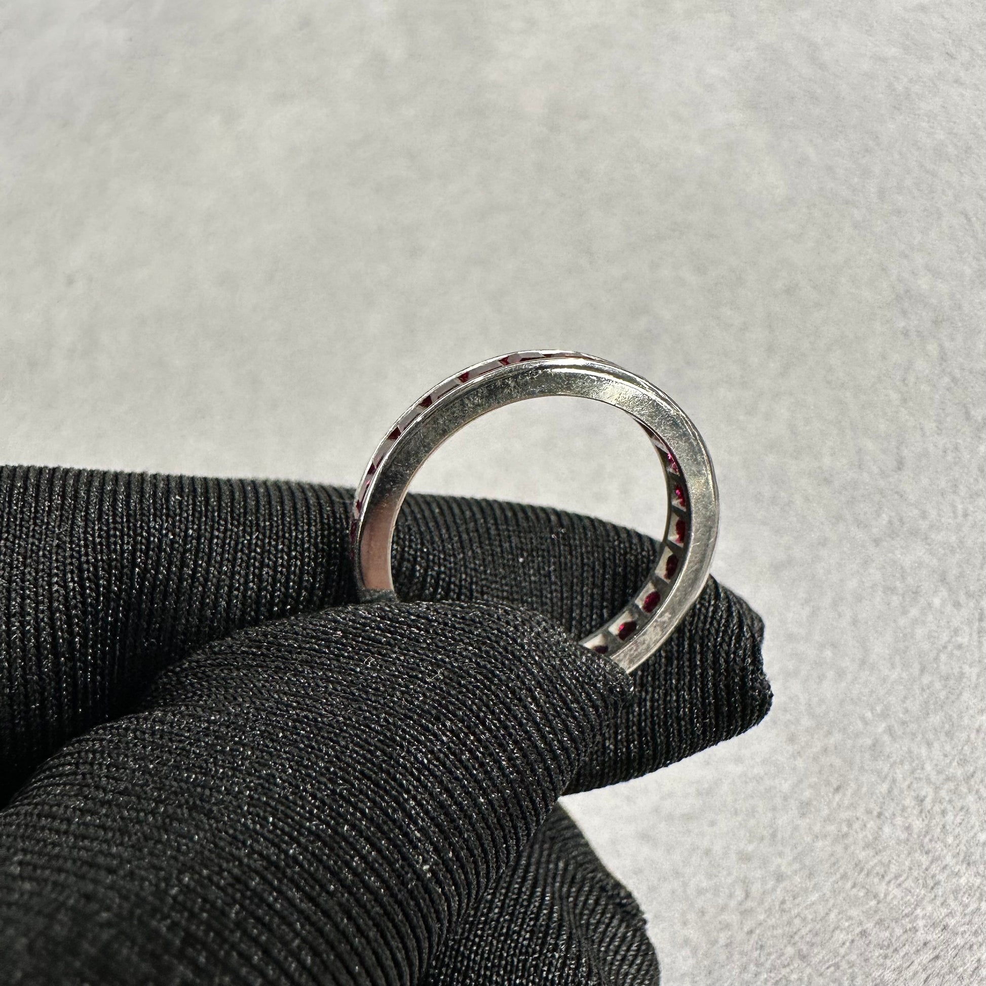 This stunning eternity band features .90ctw Asscher Cut Vivid Red Ruby set in 14kt White Gold. The\is vintage ring adds a touch of timeless elegance, while the channel setting ensures the stones remain secure. A perfect choice for stacking with other non-traditional bands, this ring adds a pop of color and sophistication to any look. Finger size 4. 2 Available.