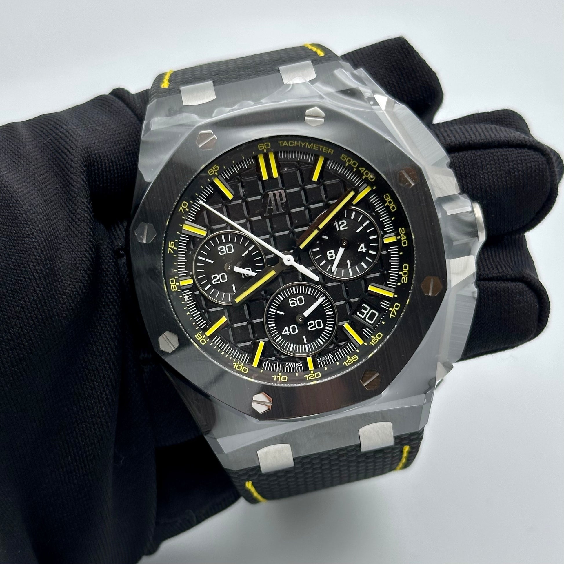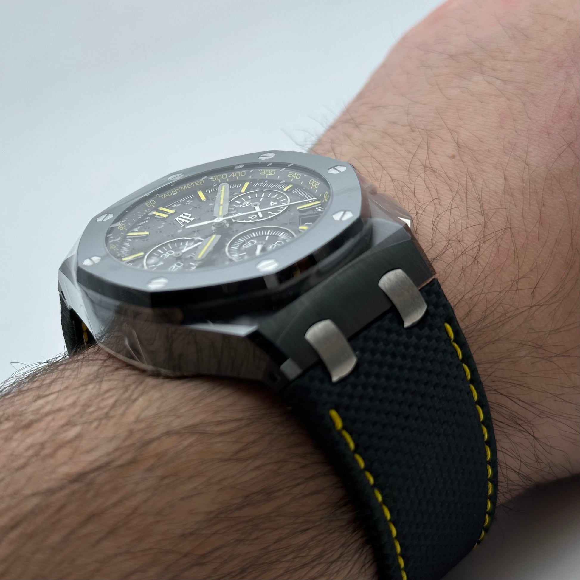 The Audemars Piguet Royal Oak Offshore Chronograph features a self-winding chronograph and a limited edition of 500 pieces, with reference number 26420CE.OO.A005VE.01. This model in black ceramic is a nod to the 1999 release of the Royal Oak Offshore "End of Days" (ref. 25770SN). The 43mm watch comes with a black calfskin strap with yellow stitching, a titanium pin buckle, and an interchangeable strap system. It also includes an additional yellow calfskin strap. The black dial displays a "Méga Tapisserie" pattern, black counters and external zone, white gold applied hour markers and Royal Oak hands with yellow luminescent coating, and a black inner bezel. This brand new timepiece is accompanied by its box and papers.