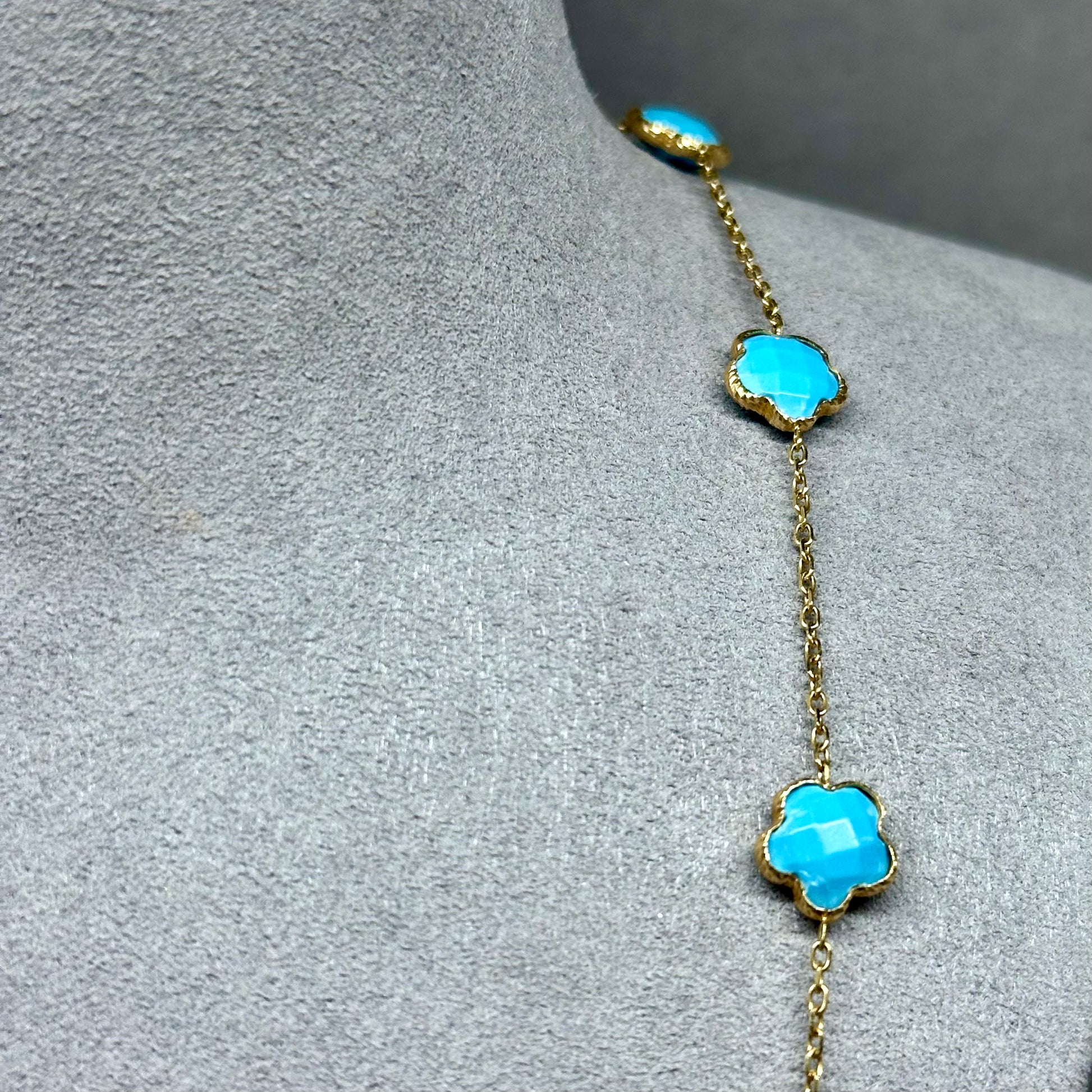 Elevate your style with Camille - a stunning 23" necklace featuring a unique clover cut and bezel set turquoise stone. Made with high quality 14kt gold, this necklace adds a touch of elegance and sophistication to any outfit. Show off your fashion sense and make a statement with Camille.