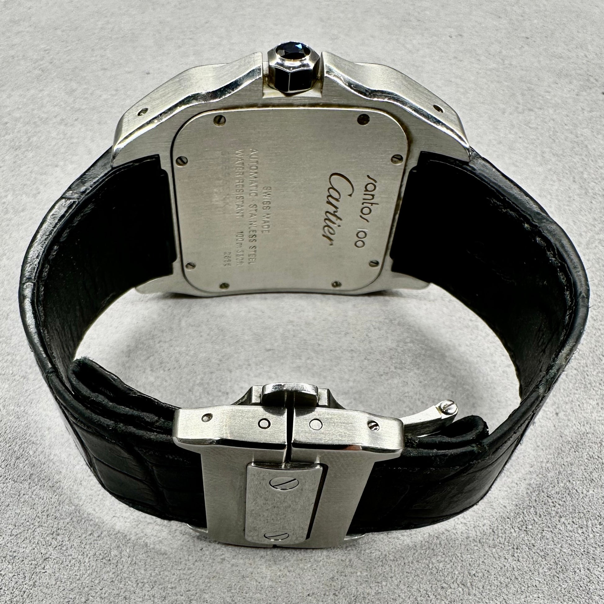Experience unmatched elegance and sophistication with the Cartier Santos 100 watch. A paragon of precision and craftsmanship, this watch pairs a stainless steel case with a silver dial and black calf skin strap for an utterly luxurious appeal. Enhanced by Roman numerals and luminous sword-shaped oxidized hands, this timepiece makes a lasting impression. Powered by automatic self-winding movement caliber 049, the watch guarantees reliable performance and precise timekeeping. Its 38.0 x 38.0 mm stainless steel case showcases an octagonal crown set with a faceted spinel, adding a touch of exclusivity. The stainless steel bezel, adorned with 8 signature screws, exemplifies the meticulous attention to detail inherent in all Cartier pieces. Adding to its sturdiness and longevity, the Cartier Santos 100 watch features a scratch-resistant sapphire crystal that ensures optimal visibility. The silvered opaline dial with painted radial roman numerals and an inner minute track contributes to the watch’s classy and modern aesthetic. Furthermore, it possesses a secret Cartier signature at VII, symbolizing its authentic and prestigious origin. To top off this elegant masterpiece, a black leather strap complements the metallic case and a brushed, polished stainless steel double deployant clasp ensures secure and comfortable wear. In good condition, the Cartier Santos 100 watch makes an outstanding accessory for the modern man and adds a touch of class to any outfit. Own a piece of luxury, own a Cartier.