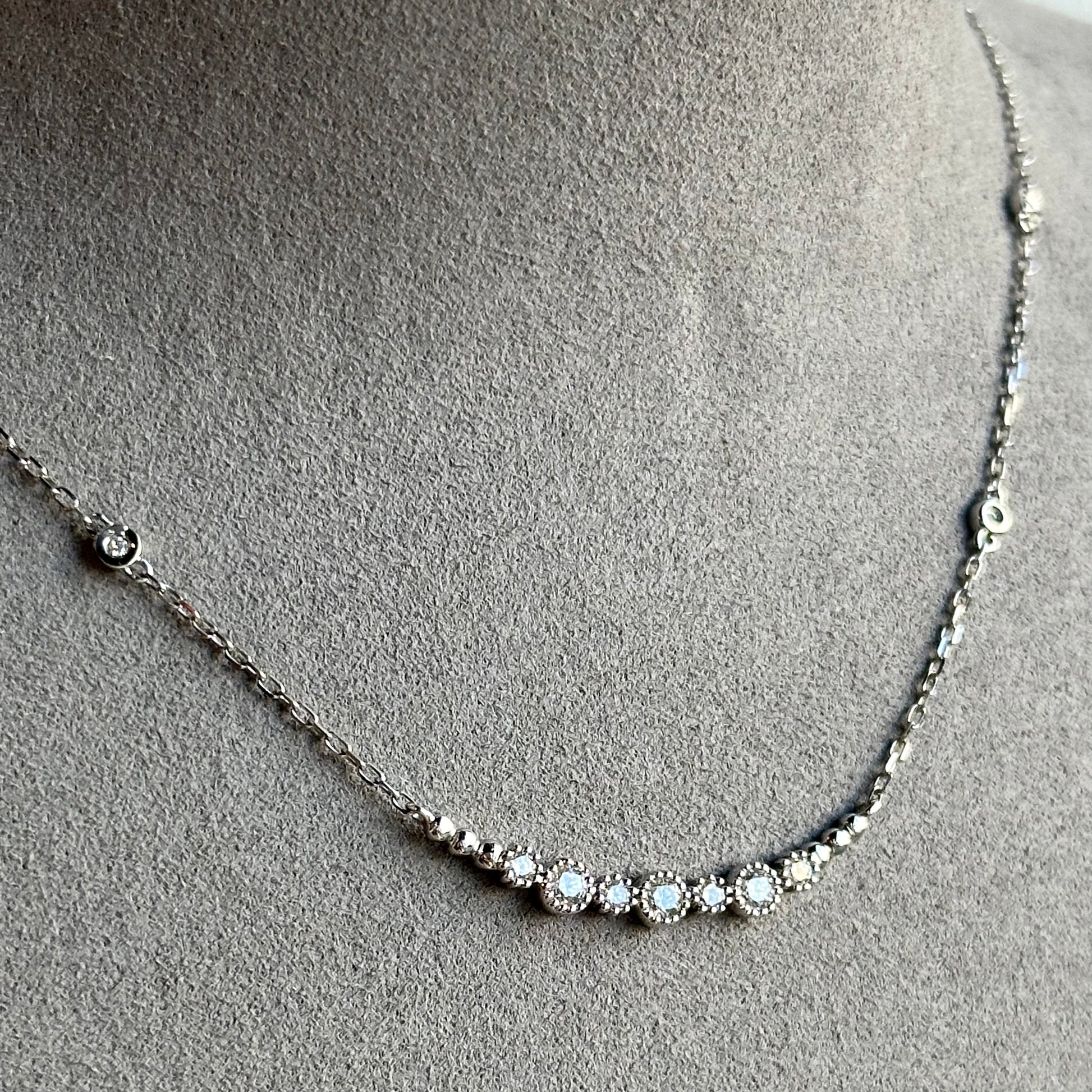 Discover a unique alternative to a traditional diamond necklace with our Diamond Beaded Milgrain Etching Bar Necklace. Crafted with care in 18kt white gold and featuring a bar of dazzling bezel-set diamonds accented by delicate milgrain etching, this necklace is sure to make a statement. The diamond detailing along the chain adds an extra touch of elegance to this everyday essential.