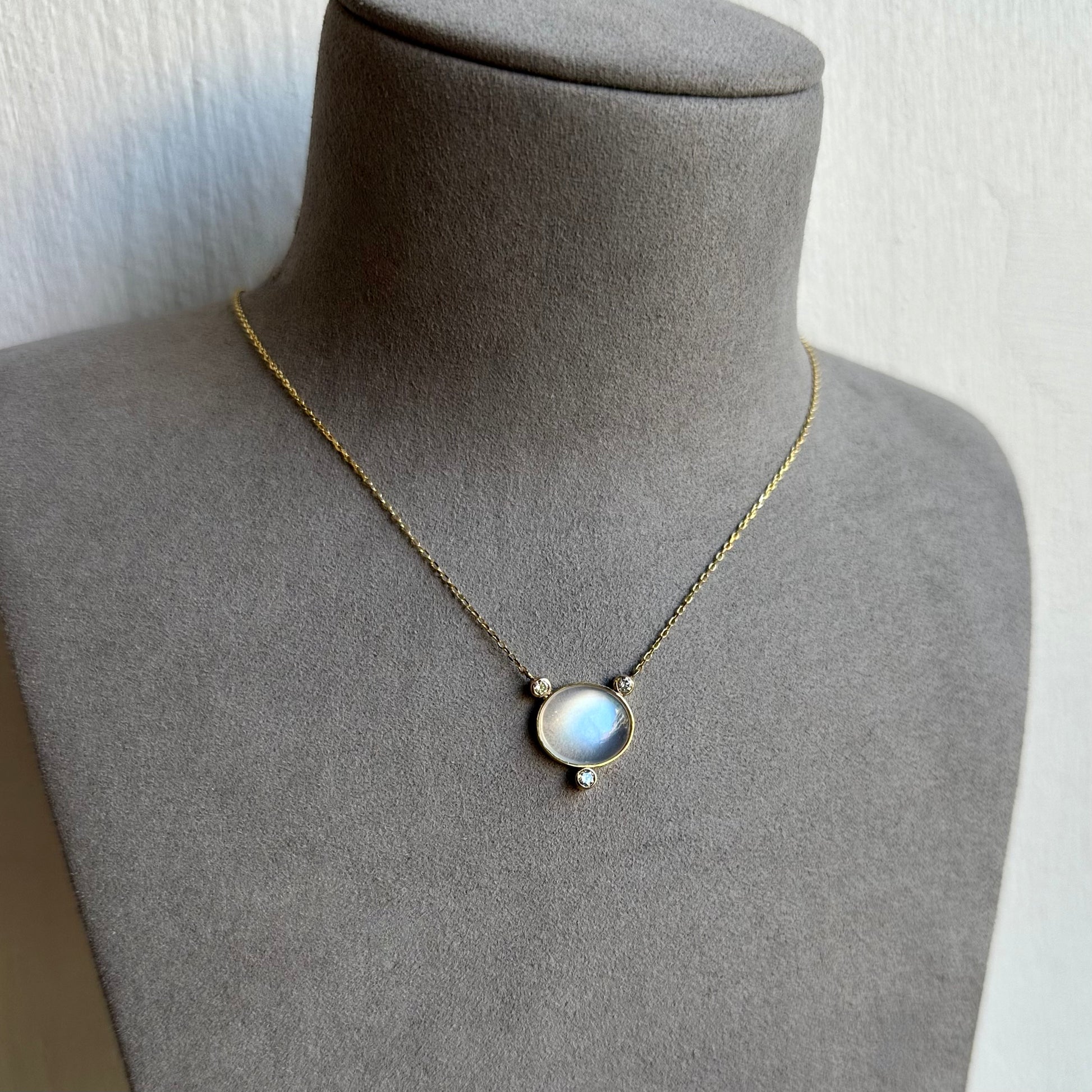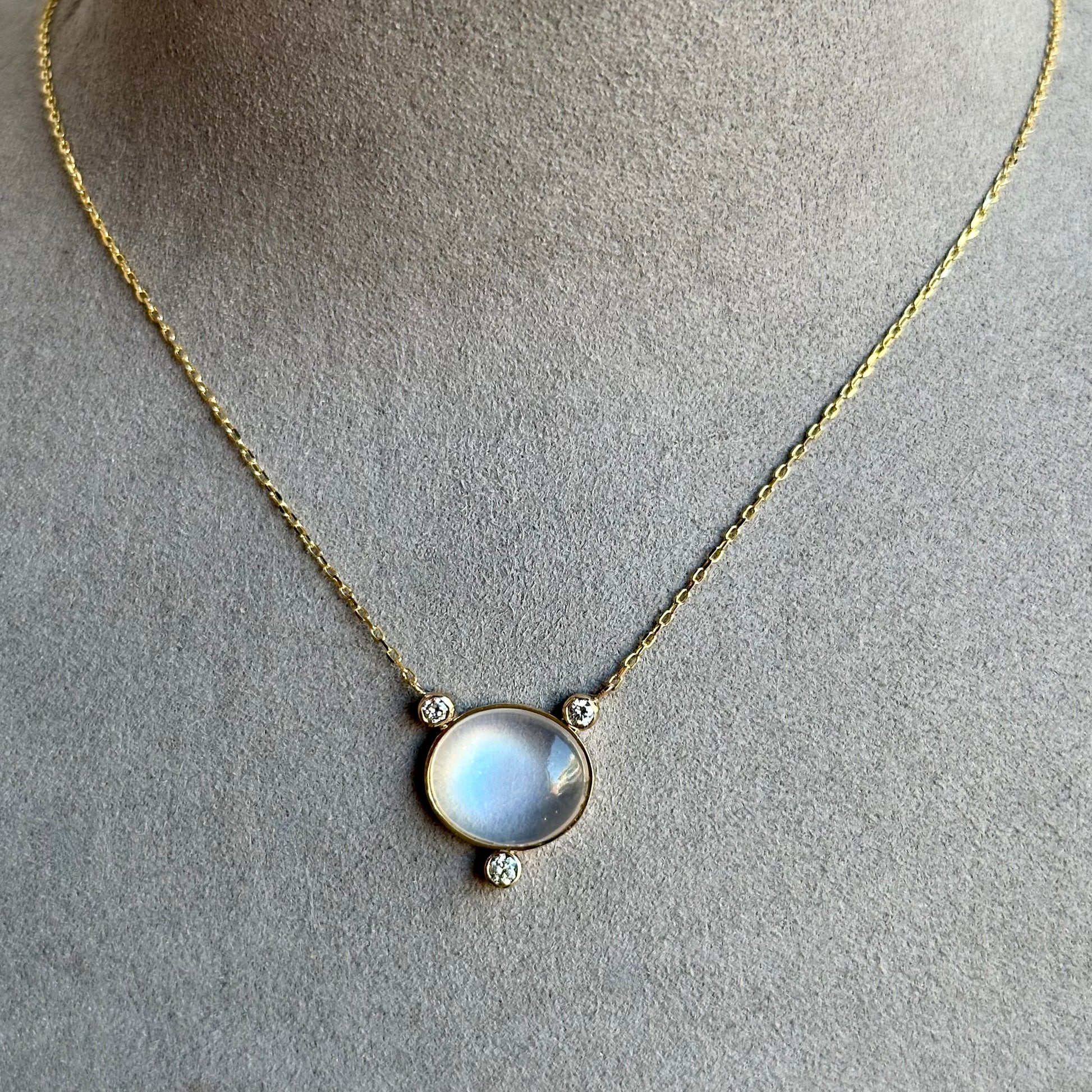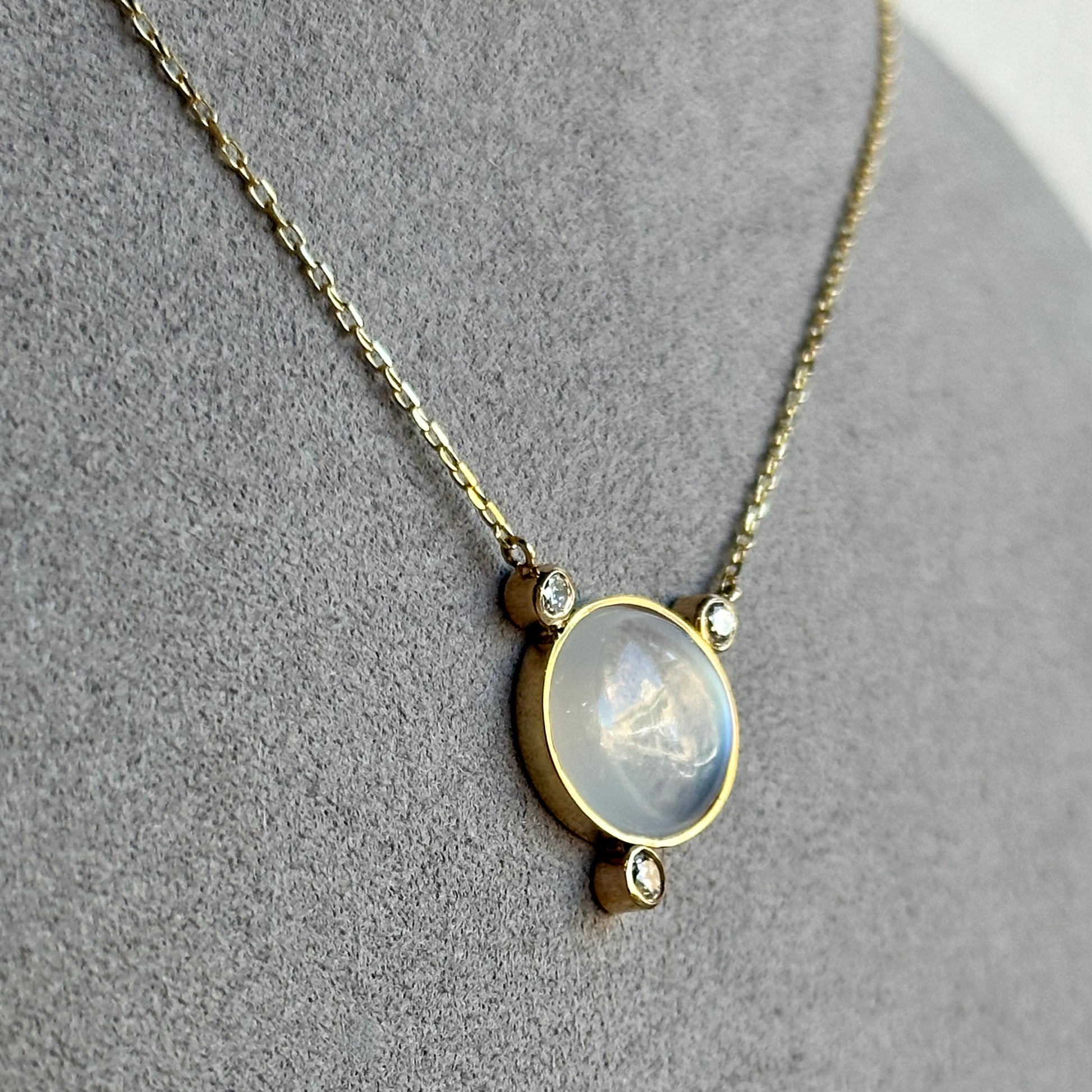 Set within a stylish bezel, the moonstone is complemented by three sparkling diamonds, adding an extra touch of elegance and sophistication. The pendant is elegantly suspended on a beautiful paper clip chain, offering a modern twist to a timeless design.