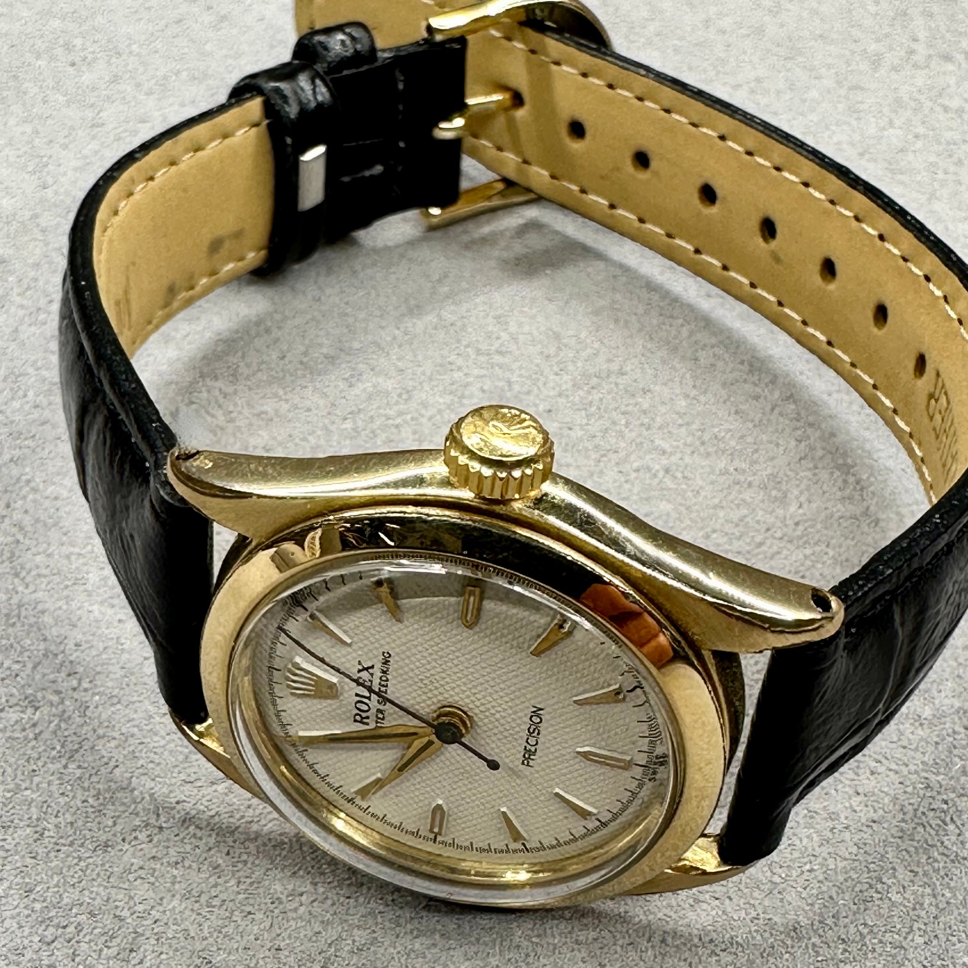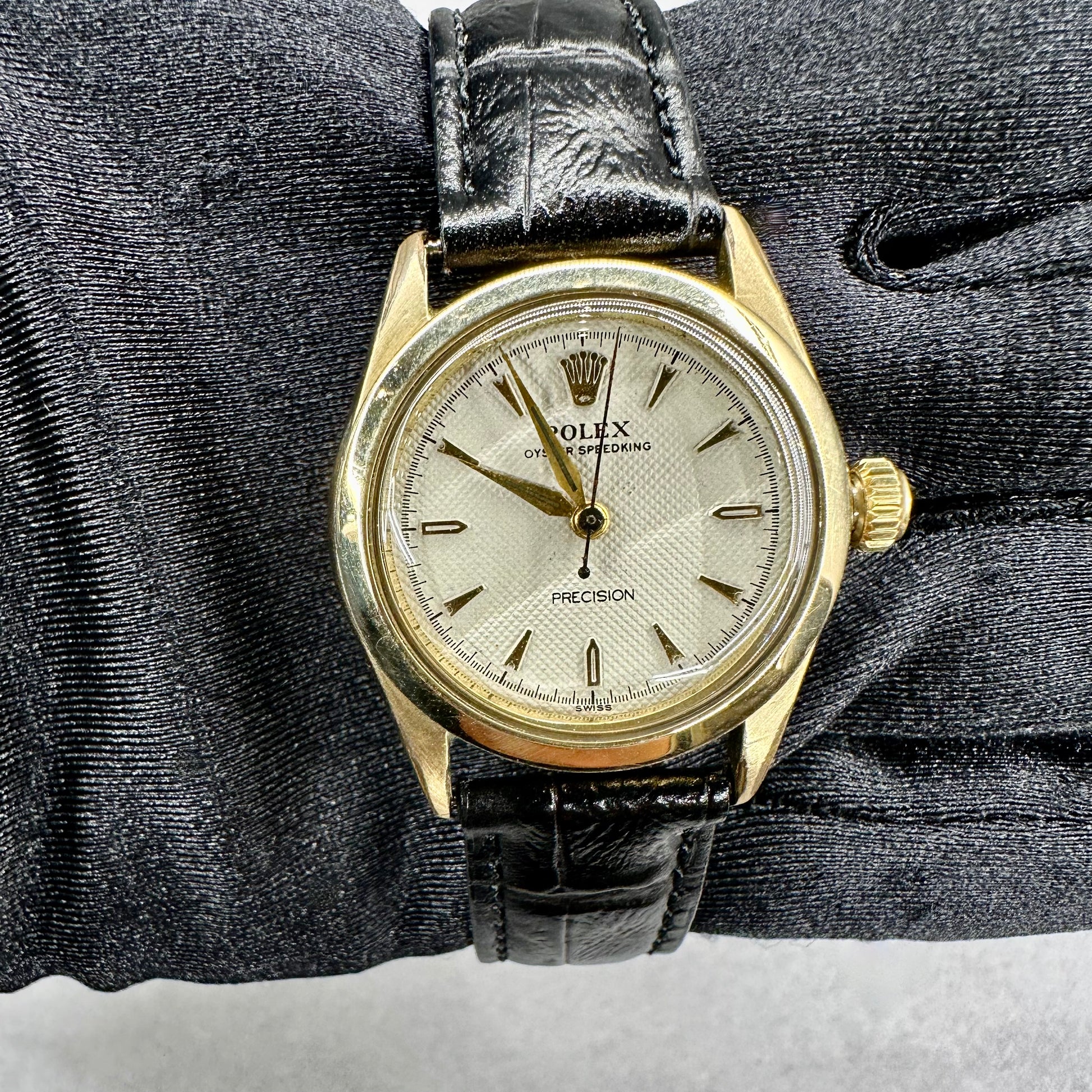 Introducing the epitome of luxury, the Rolex Speed King, an essential piece for every sophisticated watch collector. Boasting an exceedingly rare Original Waffle Dial from 1954, this gold-plated stainless steel timepiece exudes a timeless elegance that effortlessly elevates any attire. Measuring a tasteful 30mm in length and 35mm in diameter, the Rolex Speed King strikes the perfect balance between commanding attention and remaining classically understated. Its superior manual winding system, featuring 17 precious jewels and the elite Caliber 10 1/2H, ensures the pinnacle of precision timekeeping. This majestic Rolex creation prides itself on maintaining original elements, including the Silvered Waffle Dial and Dauphine Hands, adding to its vintage charm and authenticity. Complete with a luxurious 17mm alligator strap of regular length, the Speed King blends comfort with unbridled opulence. Please note, while the Rolex Speed King is accompanied by its grand legacy, it comes with no box or papers, emphasizing its exclusivity and unmatched antiquity. Capture the essence of supreme luxury with the Rolex Speed King, the timepiece that flawlessly fuses the sophistication of the past with the elegance of the present. The Rolex Speed King – a timeless testament to class and distinction.