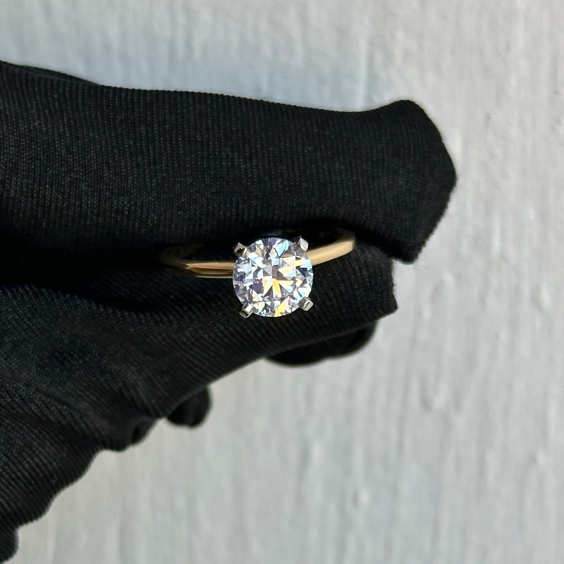 This breathtaking solitaire diamond engagement ring features a 1.84ct round brilliant diamond that is D color and VVS2 clarity, certified by GIA for its exceptional quality. Set in a classic 4-prong design, this ring combines a luxurious 18kt gold shank with platinum prongs, offering the perfect balance of warmth and elegance. The GIA-certified diamond showcases unparalleled brilliance, making this ring a timeless and sophisticated choice for the discerning couple.