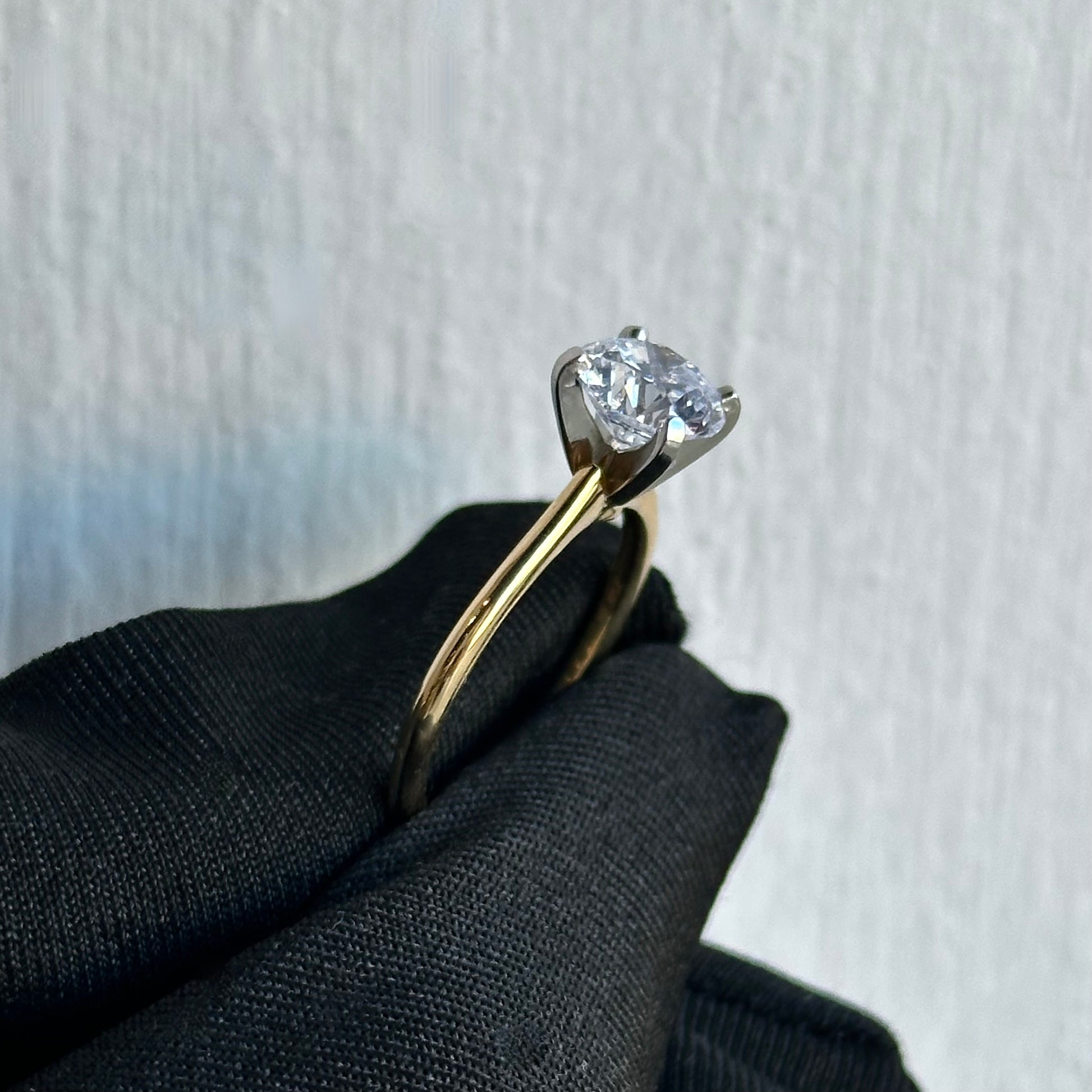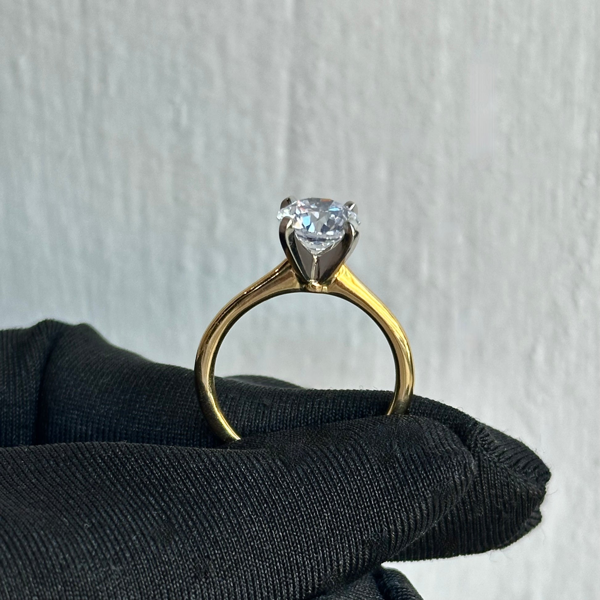 - Platinum Prongs: The 4-prong setting is made from platinum, a metal known for its strength and durability. The platinum prongs securely hold the diamond in place while enhancing its clarity and brilliance. Platinum’s cool white tone provides a stunning contrast to the gold band, creating a sophisticated and elegant aesthetic.