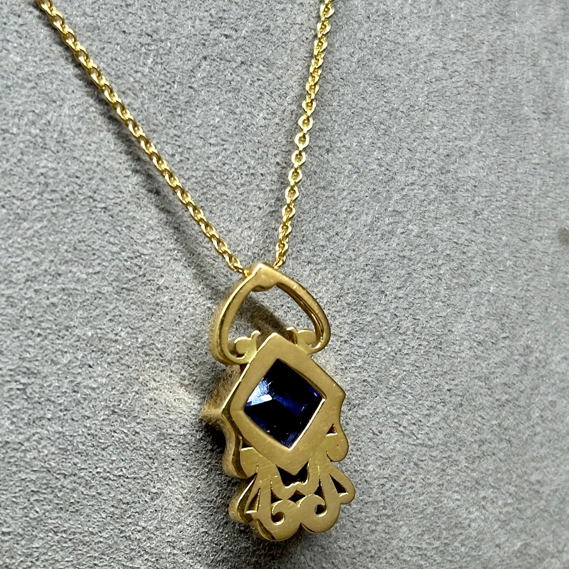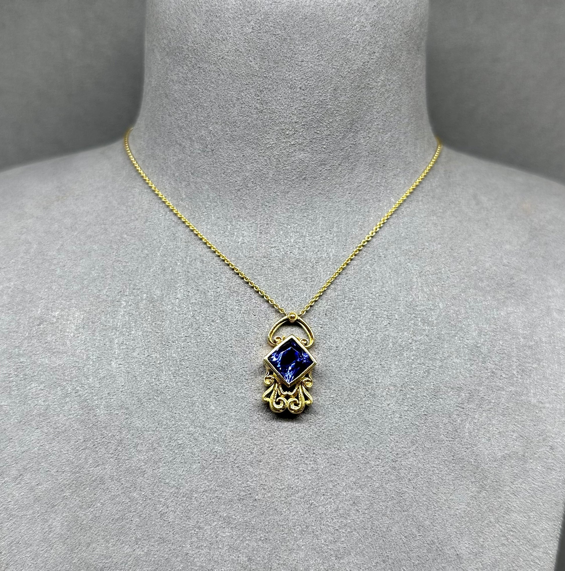 Introducing Lily - the ultimate addition to your jewelry collection. Our handcrafted Tanzanite Necklace is inspired by the Art Deco architecture of NYC and features a radiant cut AAA Tanzanite gemstone set in 18kt yellow gold. Elevate your style and make a statement with this one-of-a-kind piece. Designed and made with love in house by Facets.