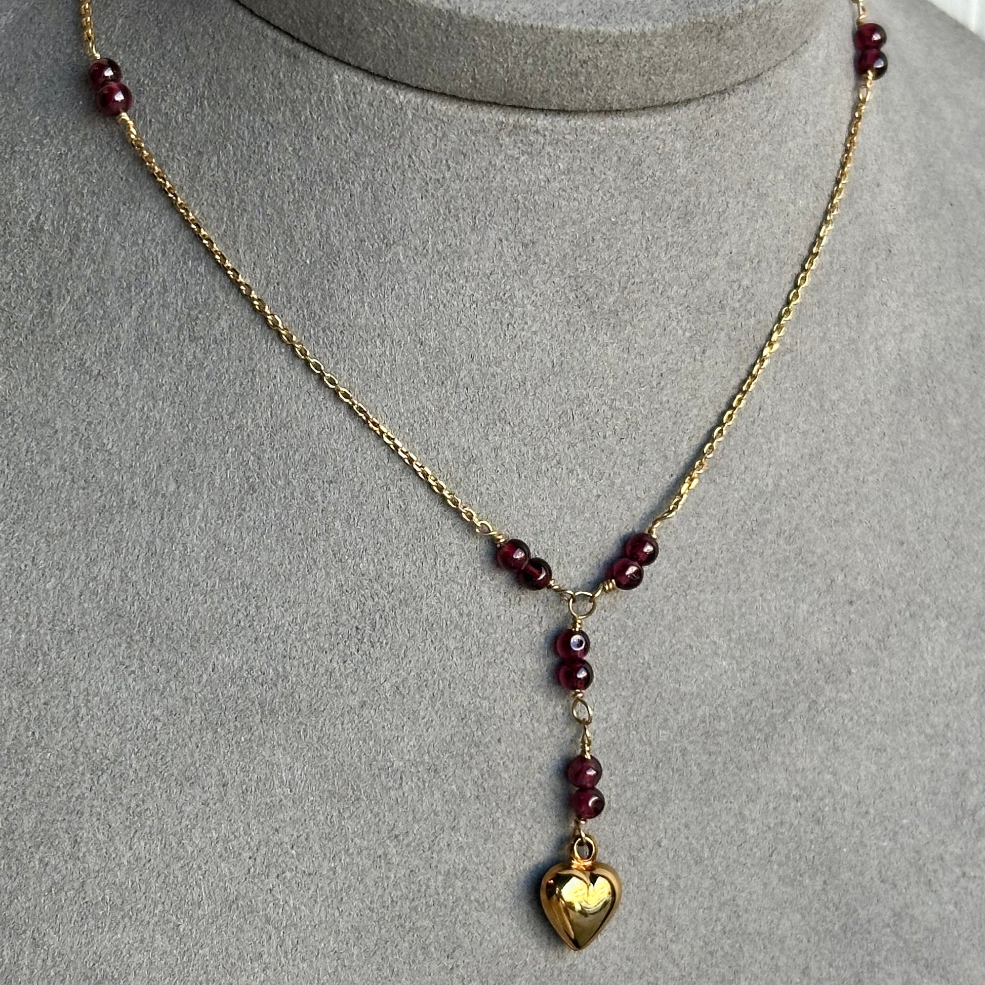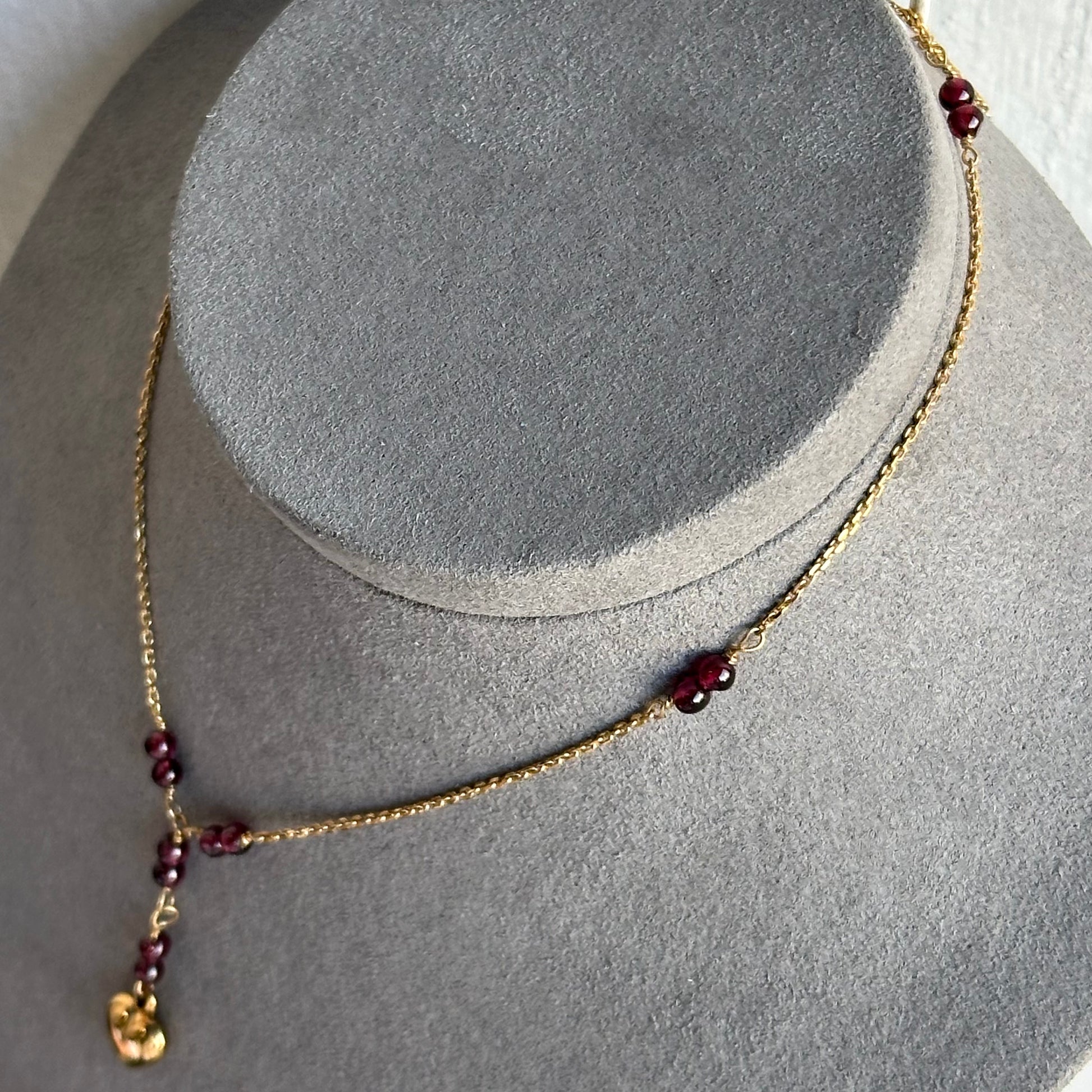 The 18" chain provides a delicate yet secure fit, while the drop-down bubbly heart pendant adds a playful and romantic touch. Perfect for layering or as a statement piece, this vintage garnet necklace is ideal for both everyday wear and special occasions.