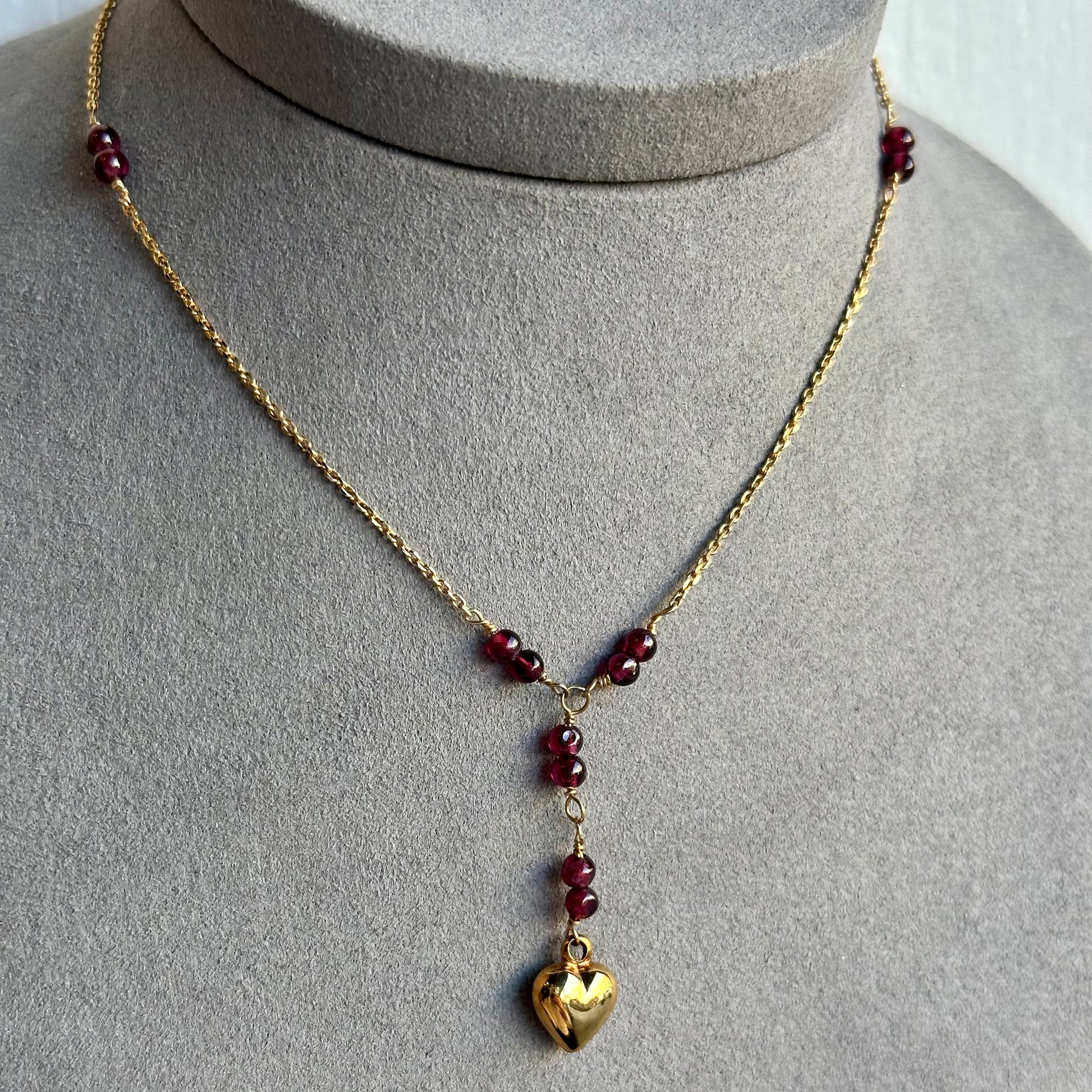 Vintage 14k Yellow Gold Garnet Lariat Necklace with Bubbly Heart Pendant – 18" Chain