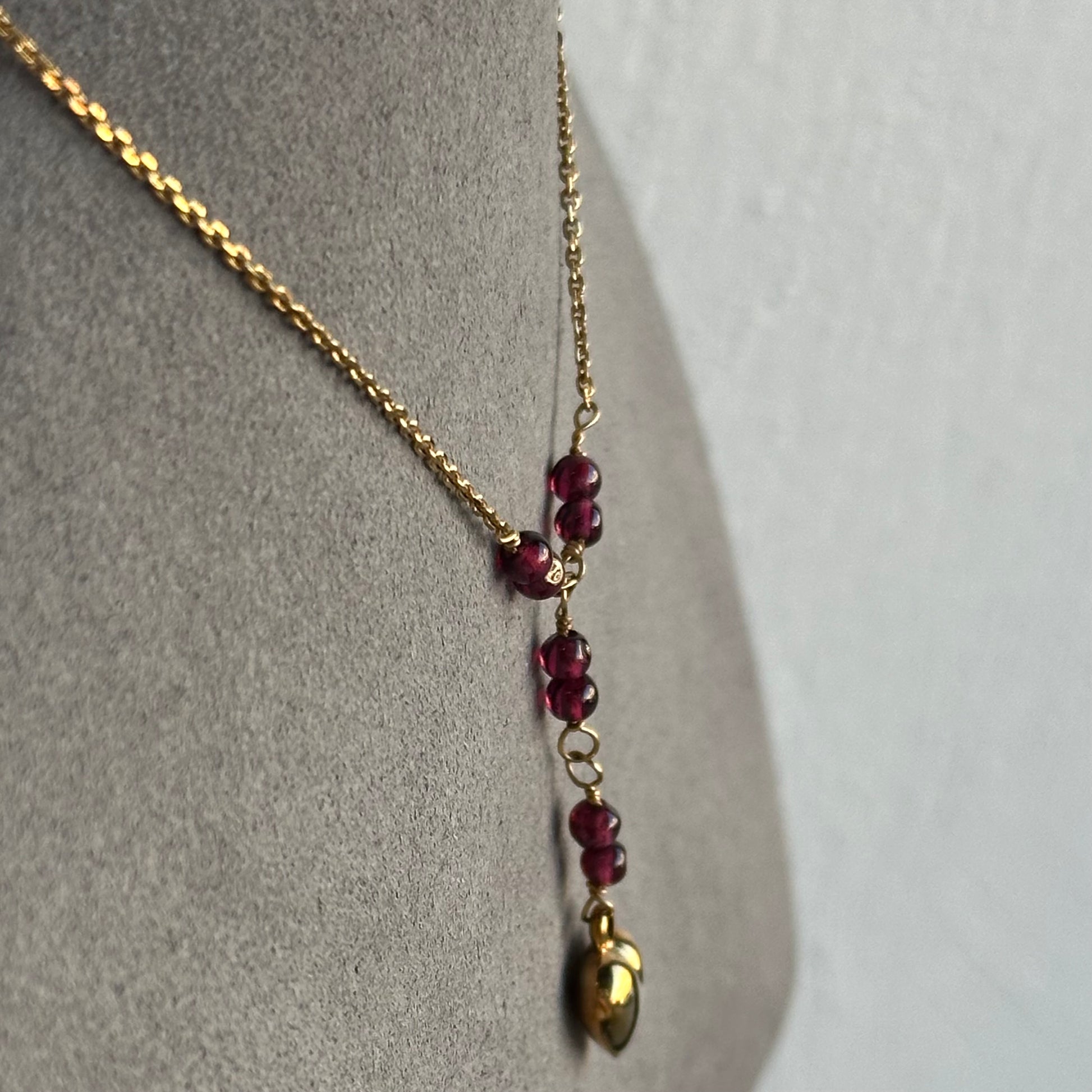 Elevate your jewelry collection with this vintage 14k yellow gold garnet lariat necklace, a timeless piece that beautifully blends classic style with modern elegance. Featuring a stunning heart-shaped lariat design, this necklace showcases garnet cabochon beads that add a rich, deep hue to the overall piece.
