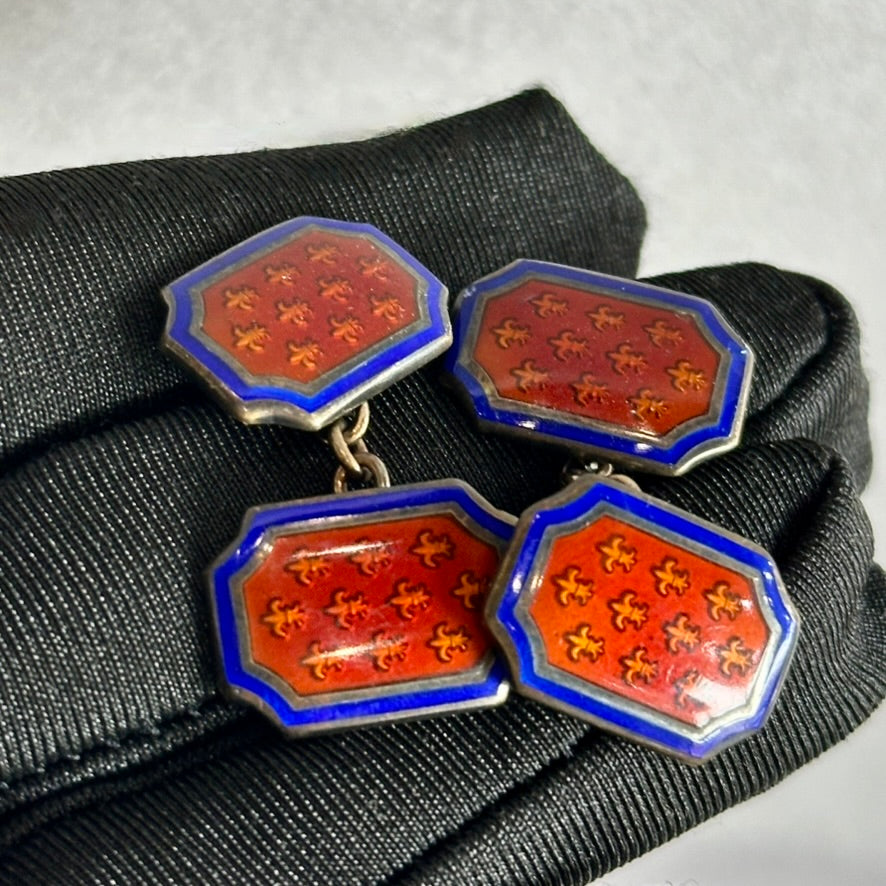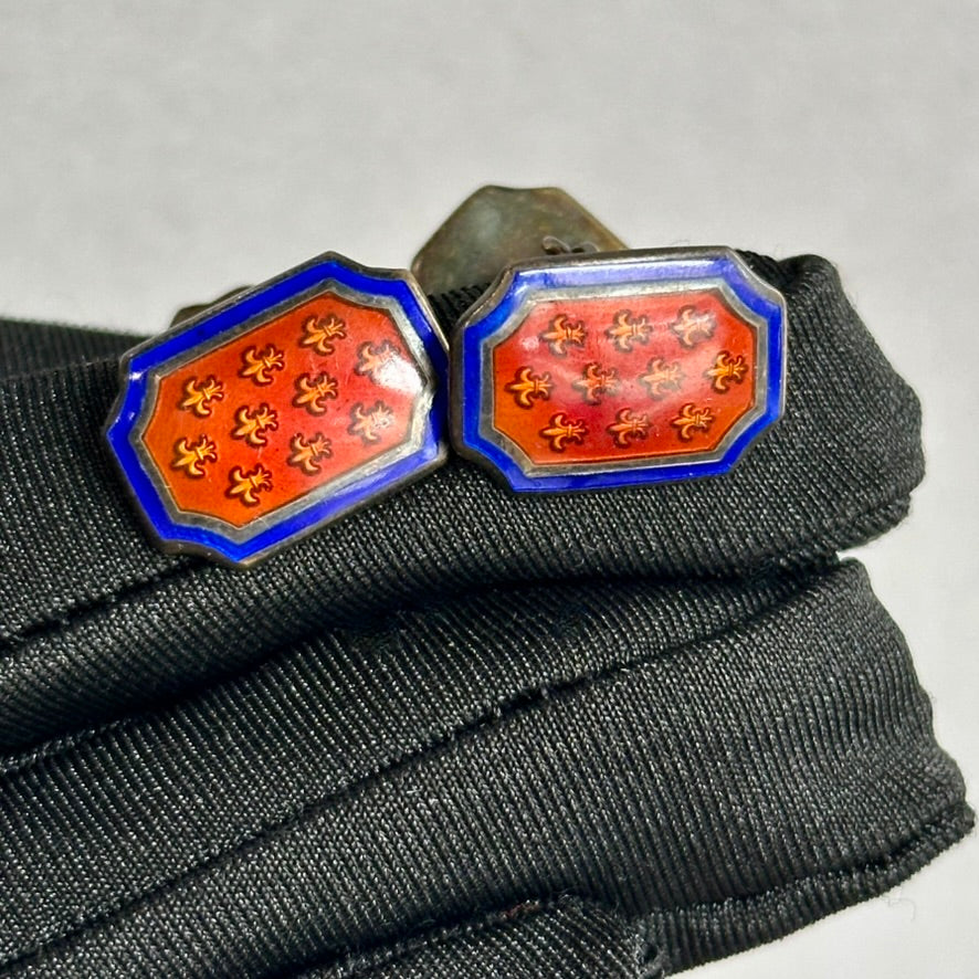 Make a bold, regal statement with these vintage enamel Fleurs-de-Lis cufflinks, featuring a striking red enamel center framed by deep royal blue enamel, all set in an elegant coffin-shaped rectangular design. The intricate Fleurs-de-Lis motif adds a touch of aristocratic charm, making them perfect for those who appreciate style with historical flair.