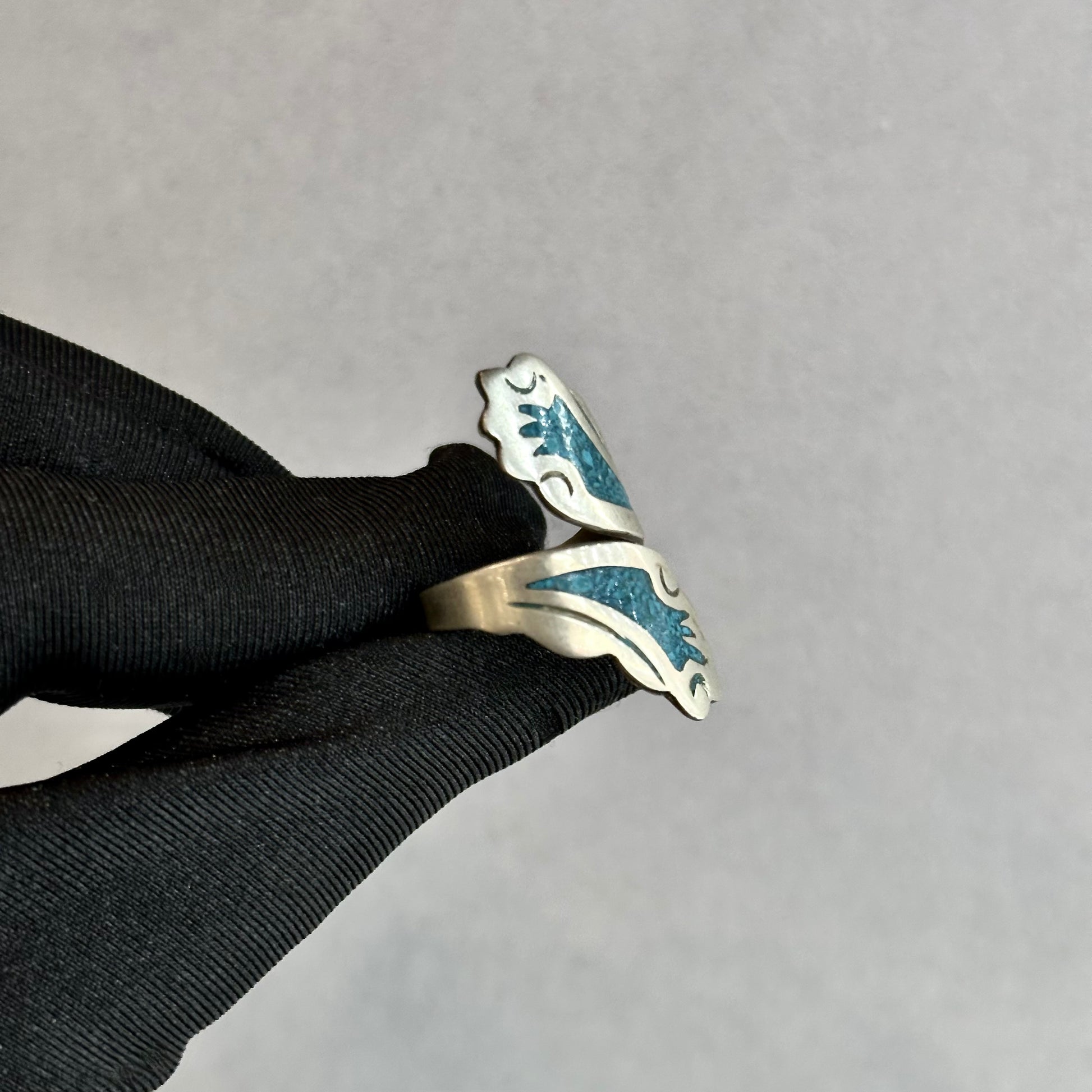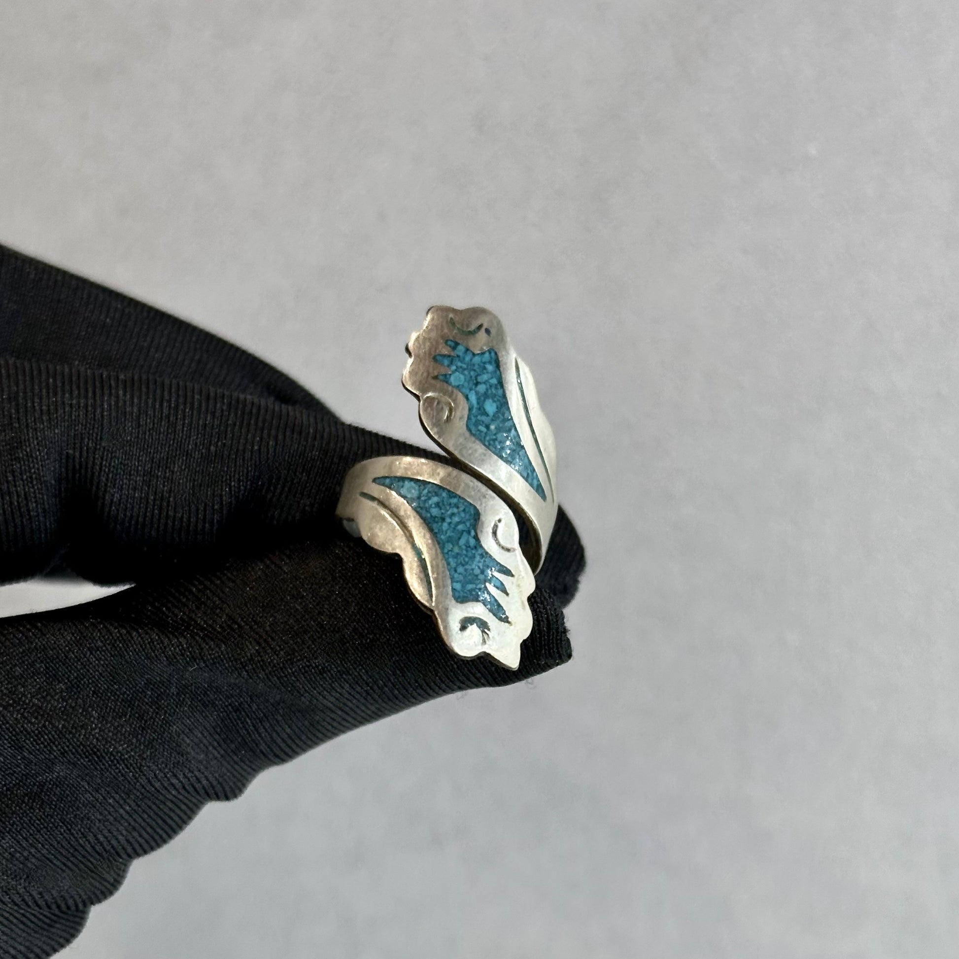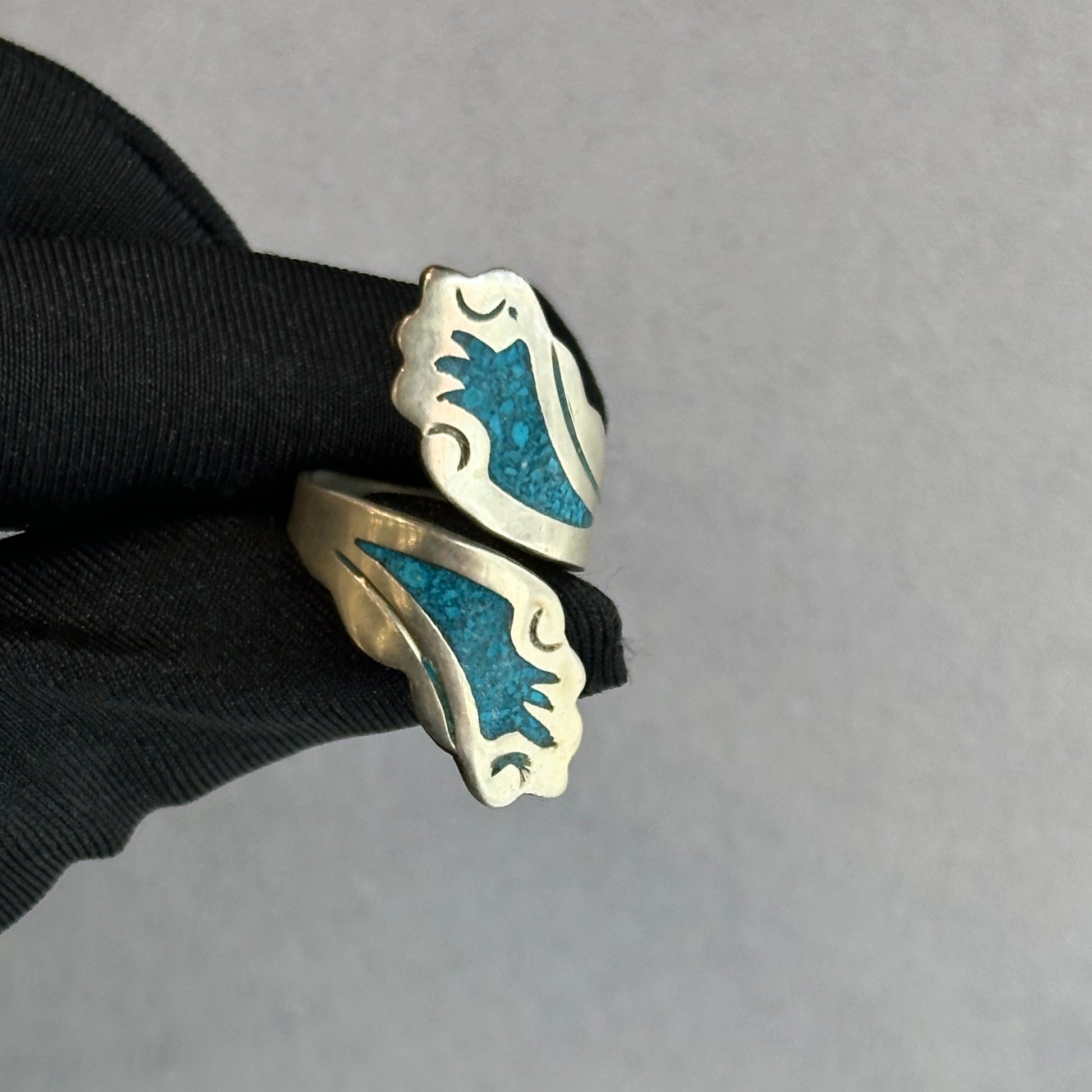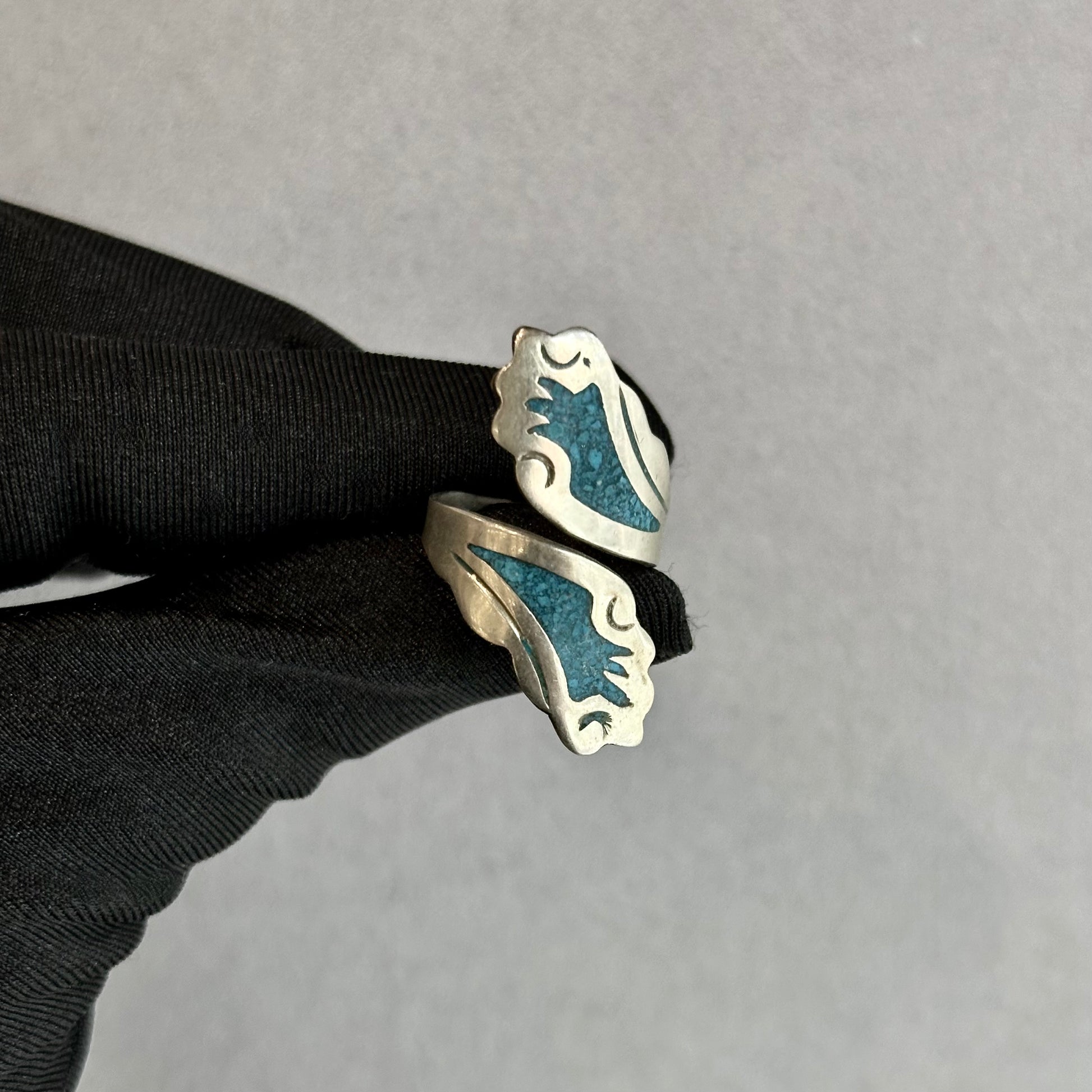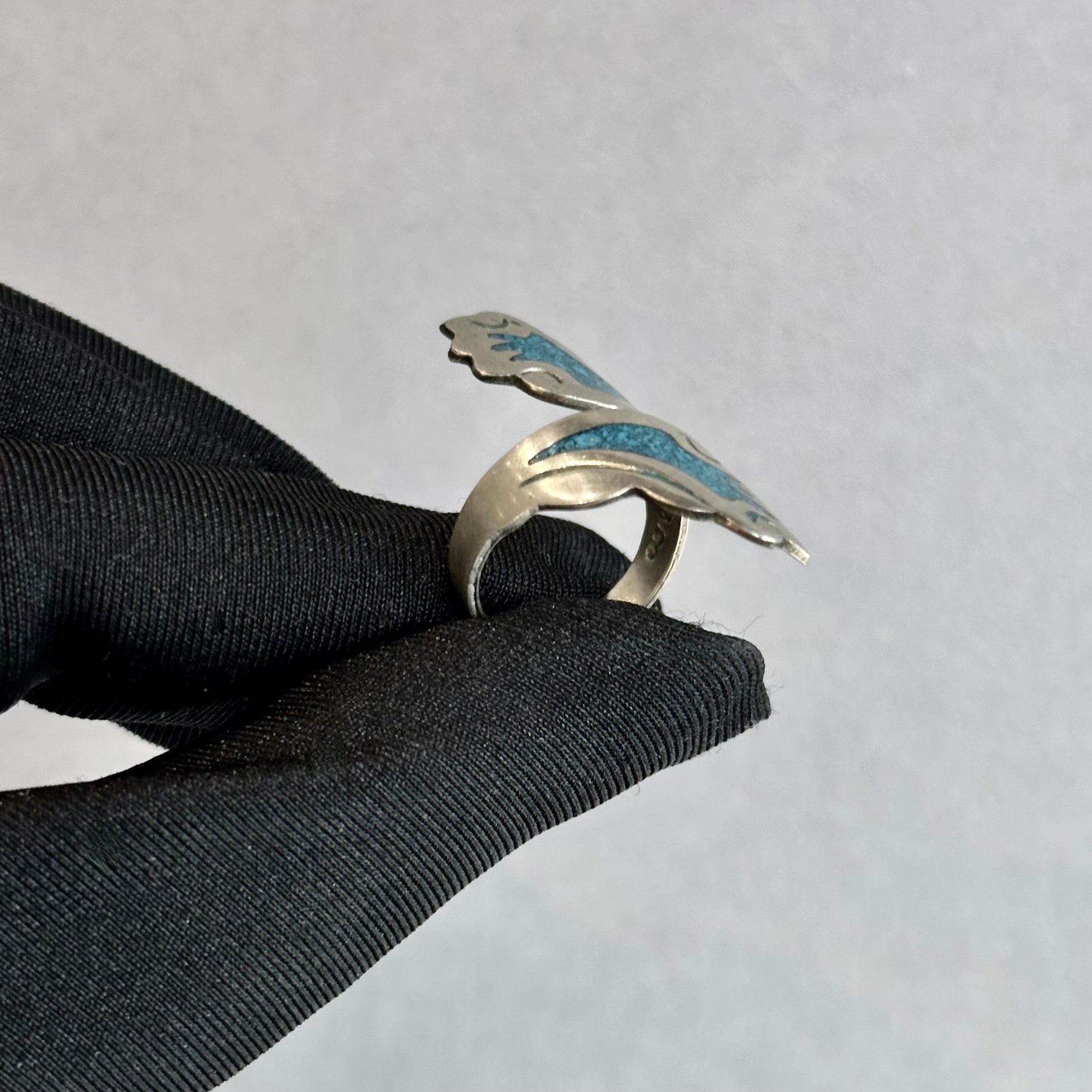 This vintage sterling silver open swirl ring with turquoise inlay is a true statement piece for those who appreciate genuine craftsmanship and the beauty of vintage design. Add this unique ring to your collection and enjoy its timeless appeal.