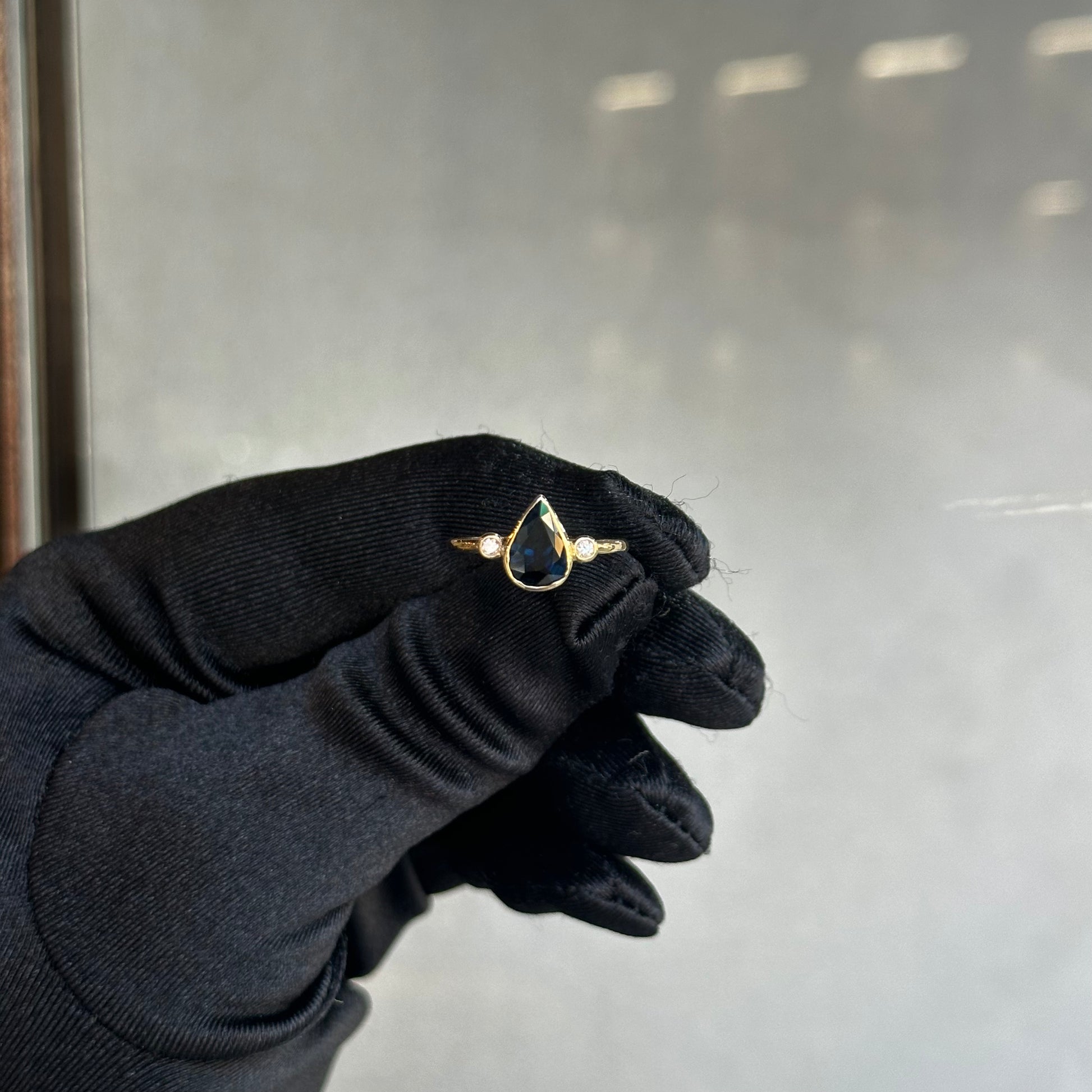 Yellow Gold Bezel Pear Shape Blue Spinel and Round Diamonds Ring